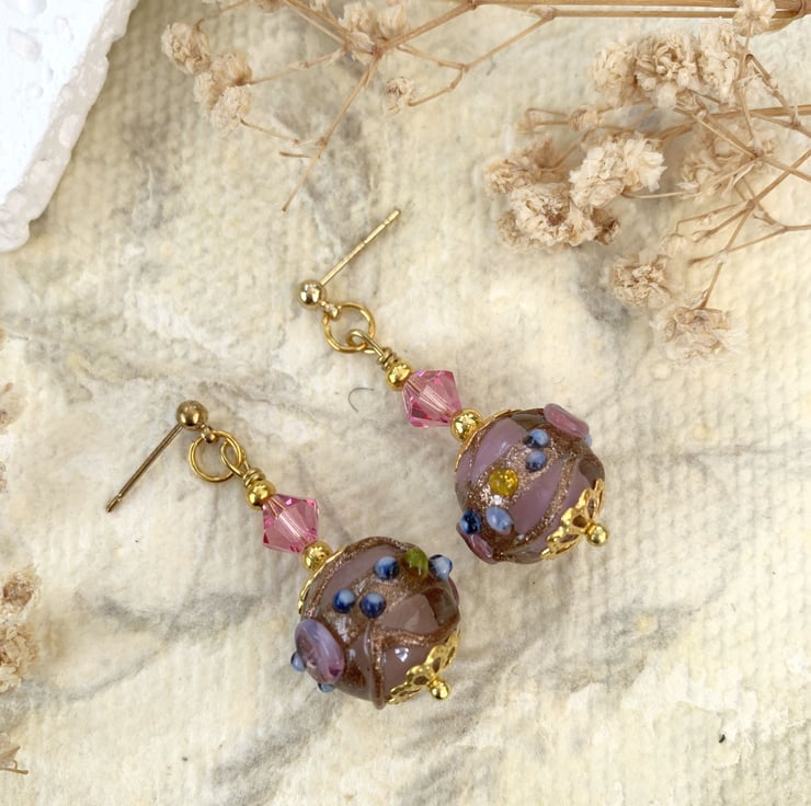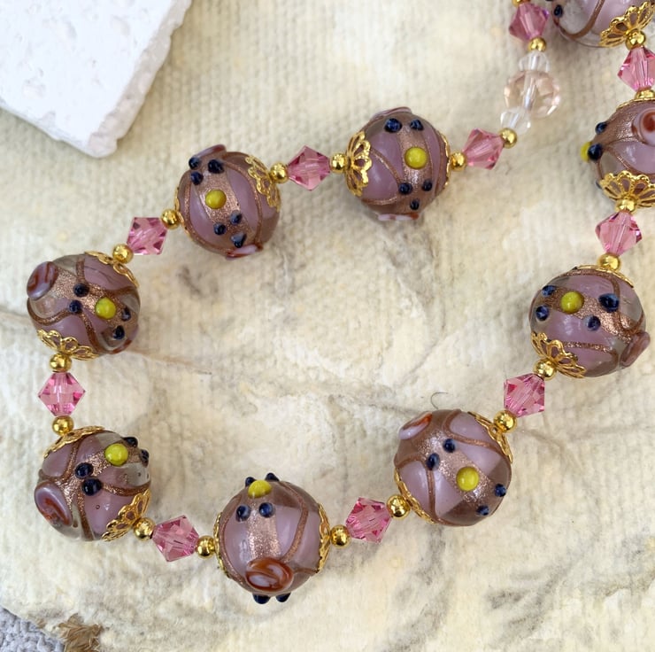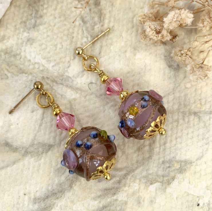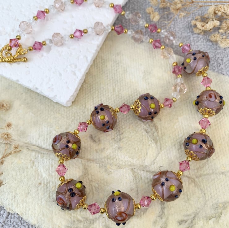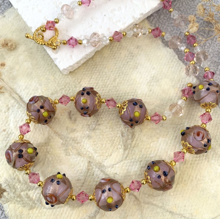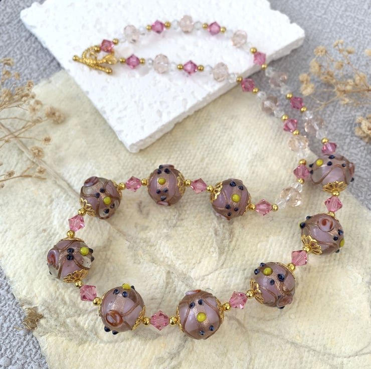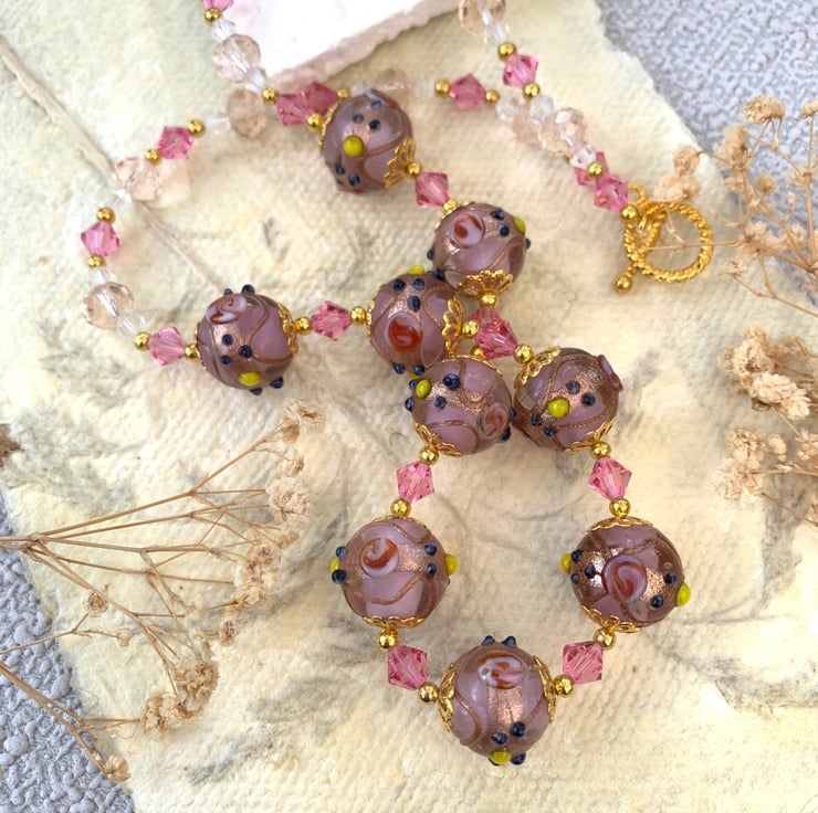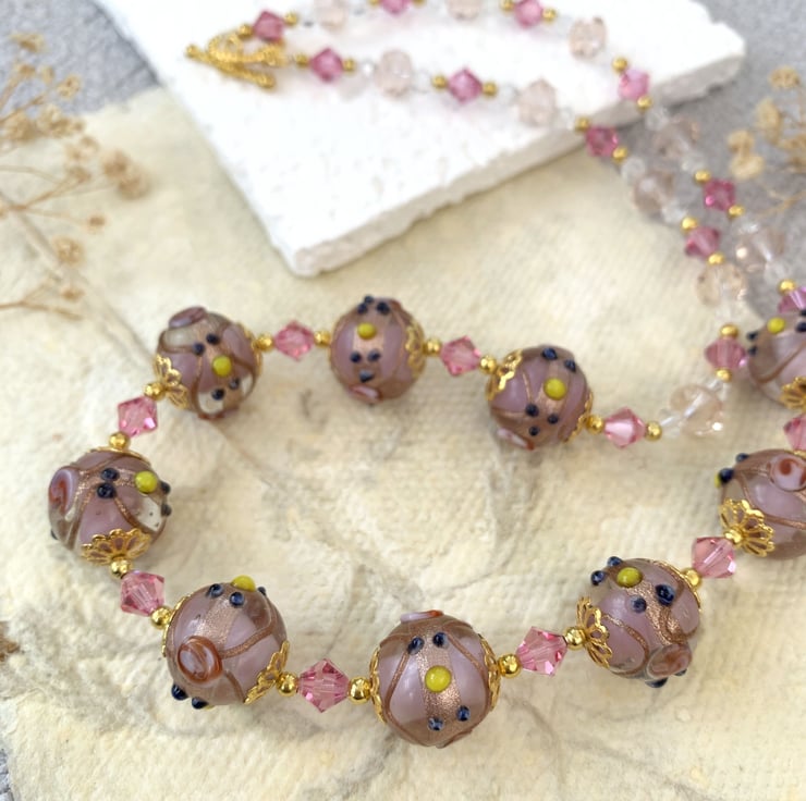 This pretty necklace set is made with pink vintage wedding cake beads that are richly textured with tiny rose flowers and rose gold glitter decoration. The main wedding cake beads are interspersed with tiny pink glass crystal beads and gold plated beads. Each wedding cake bead has gold plated bead caps. The necklace is finished with a gold plated toggle fastening.