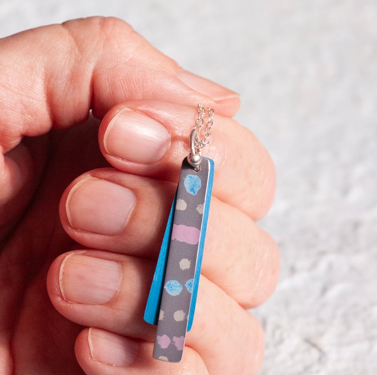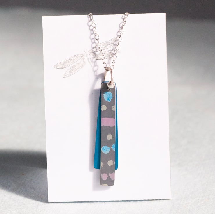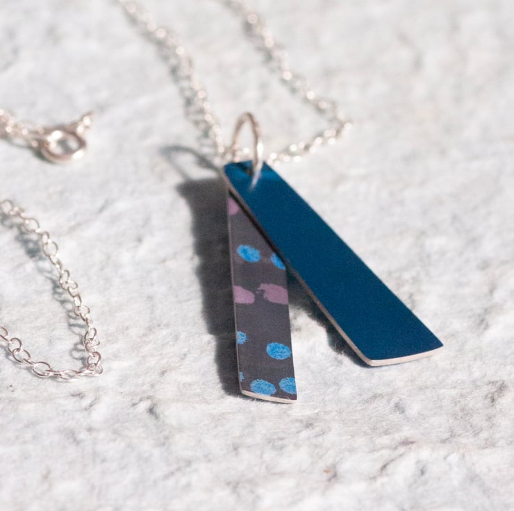 Made from anodised aluminium that has been hand sawn and dyed to give this individual pattern. It hangs on a 45cm (approx 18” ) sterling silver chain and is 44mm long.