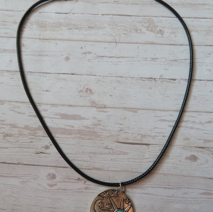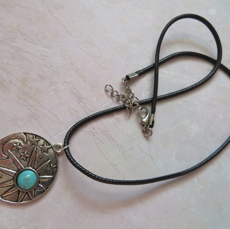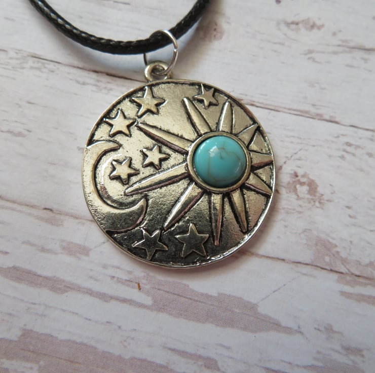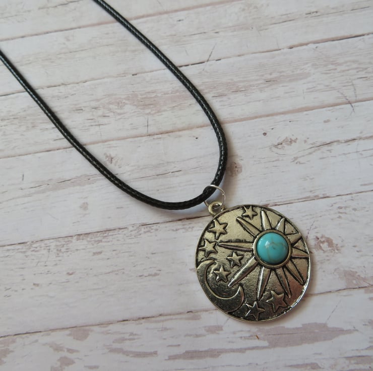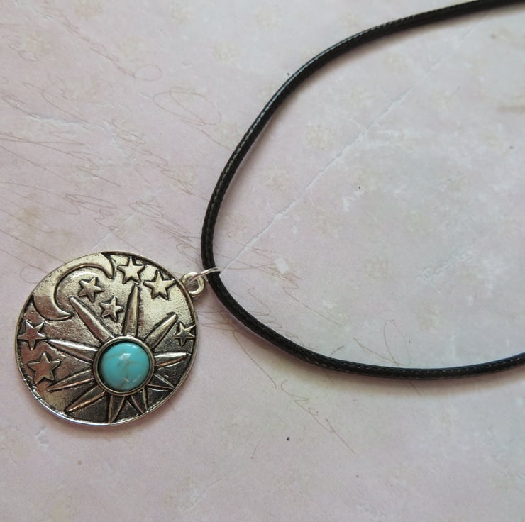 A celestial-inspired choker featuring a round silvertone pendant adorned with a radiant sun, crescent moon, and starry detail, set with a dreamy faux turquoise cabochon.