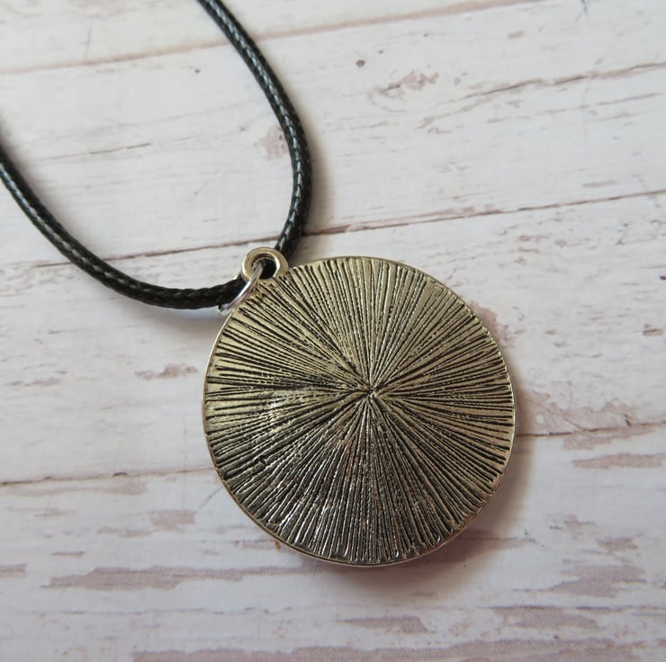 The pendant is crafted from a lightweight zinc alloy and suspended from a soft black cotton braided cord, finished with a lobster clasp and adjustable extender chain for a comfortable fit.