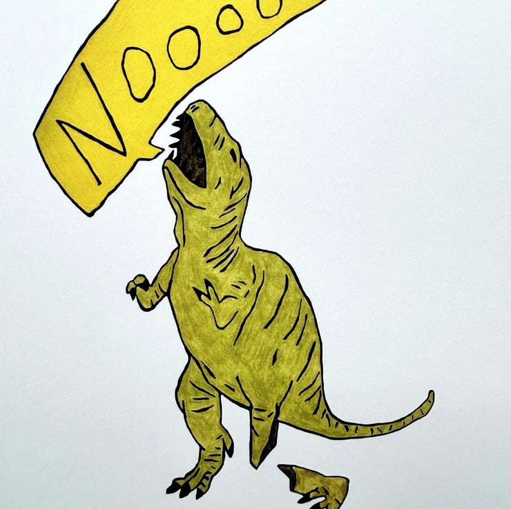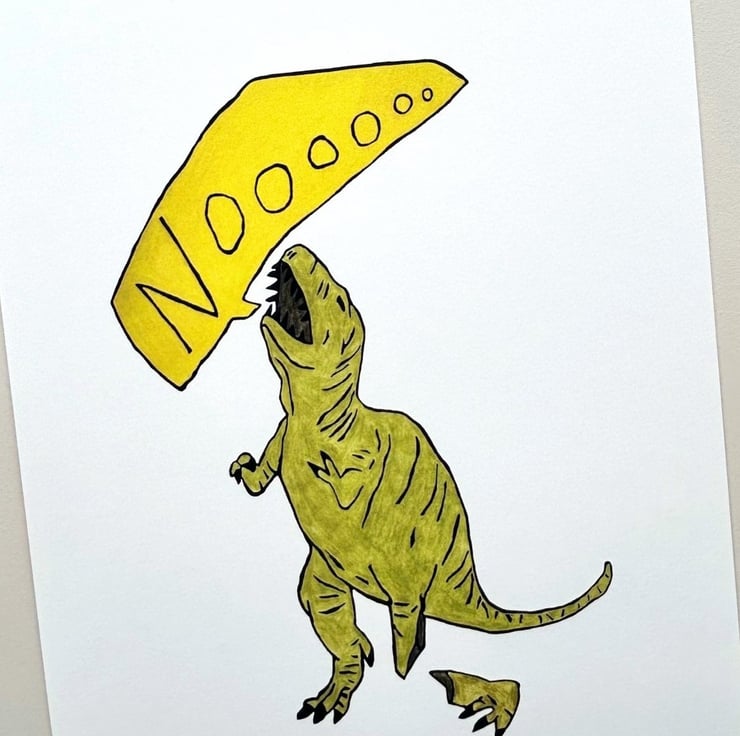 This series of ongoing prints is inspired by a broken toy dinosaur that I found. Each one shows how the dinosaur is coping with the ridiculous situation he has found himself in.