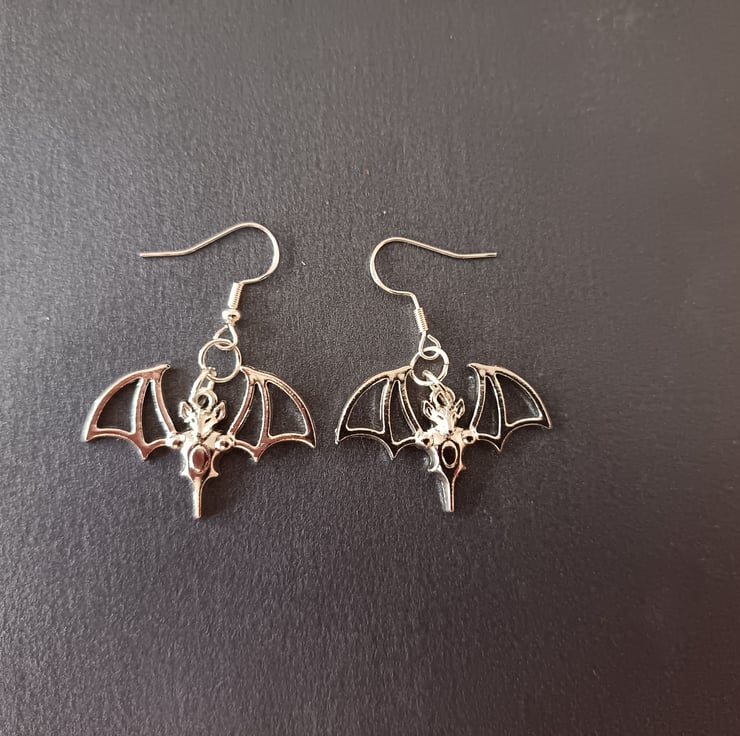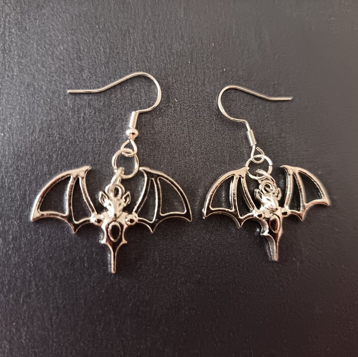 Handmade dangle earrings crafted from stainless steel hooks and large sterling silver bat charms. Alternative/ gothic style and ideal for fellow bat lovers or for Halloween celebratory jewellery