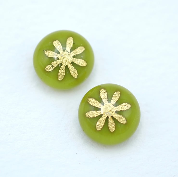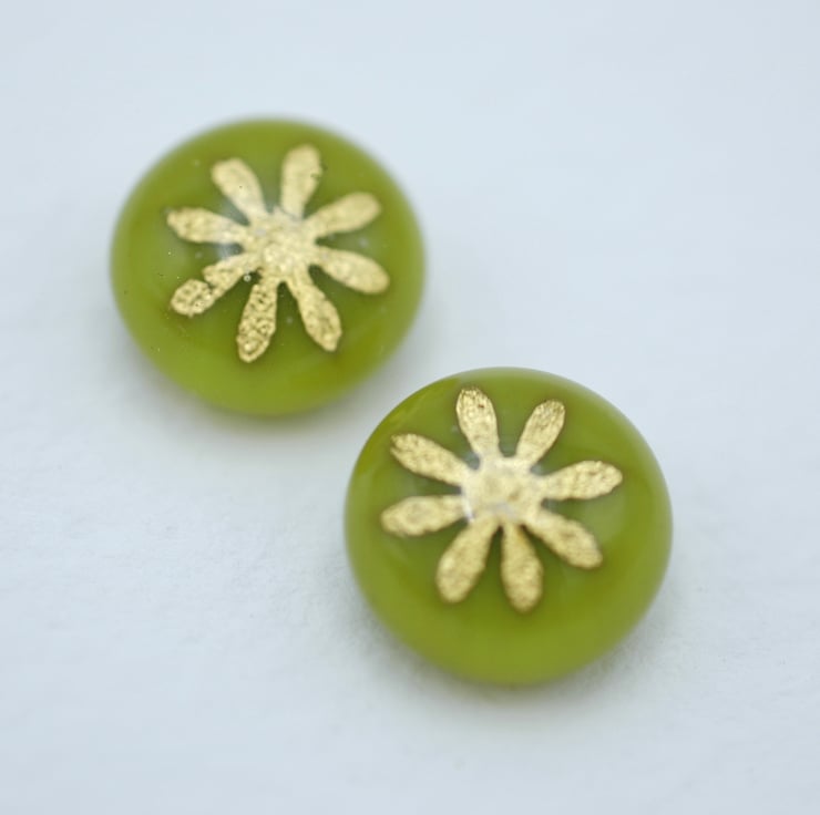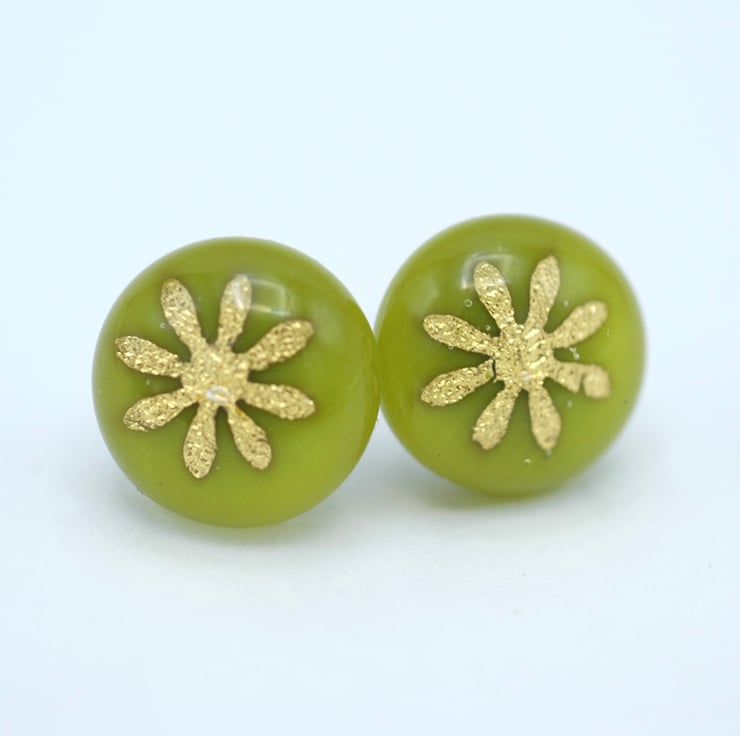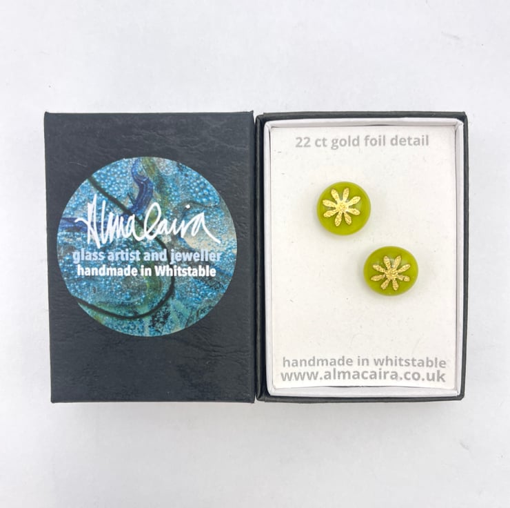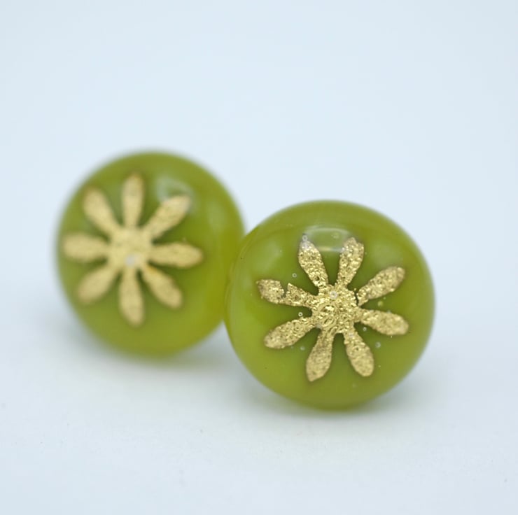 Beautiful green fused glass stud earrings with 22 carat gold foil flower detail.
