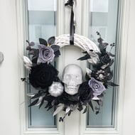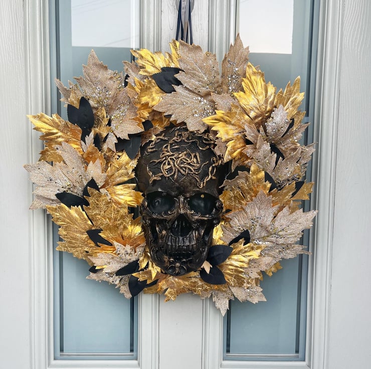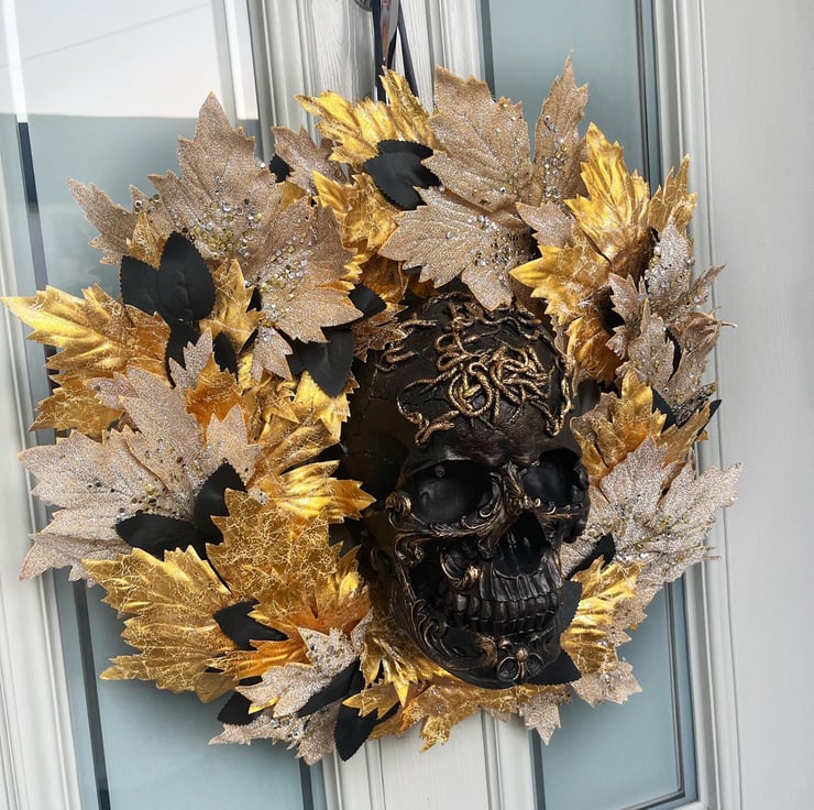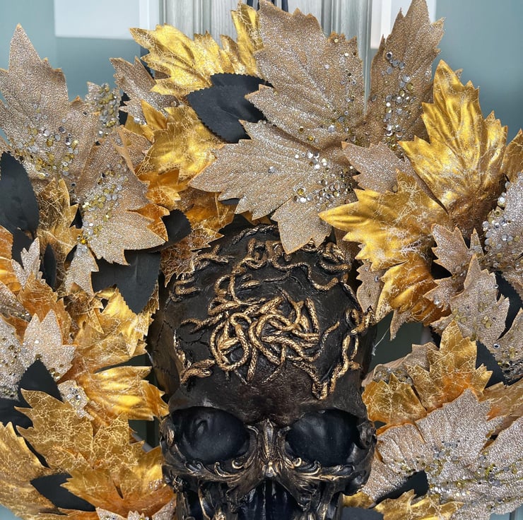 A beautiful gothic artificial autumn wreath for front door constructed onto a 35 cm white wicker base. This wreath is decorated with black and gold leafs. In the middle is a black skeleton ornament that is hanging from wires so freely floating in the middle. They eyes light up and batteries can be easily changed due to the base being accessible (batteries included).