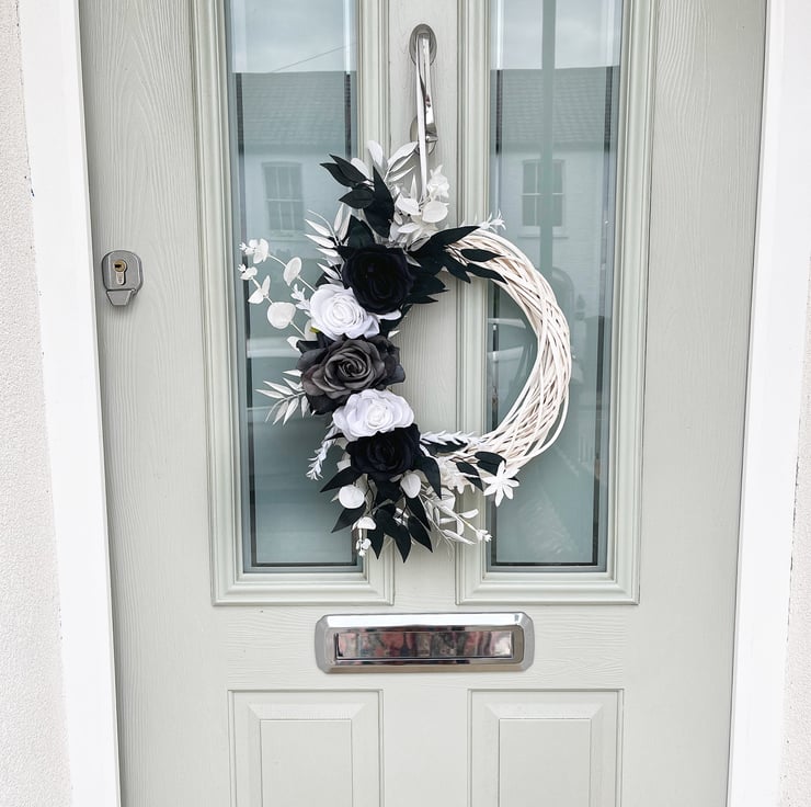 This wreath is constructed onto a thick white wicker wreath frame. The frame measures 35 cm in width and is decorated with white, black and silver foliage and black and white roses.
