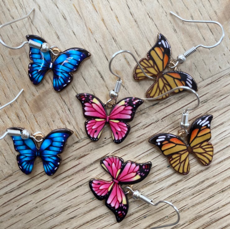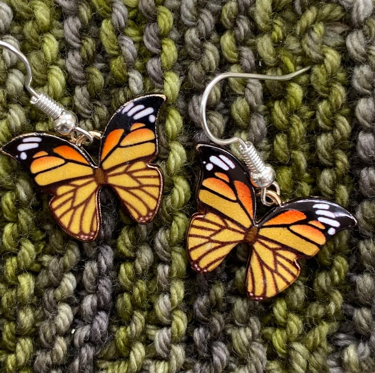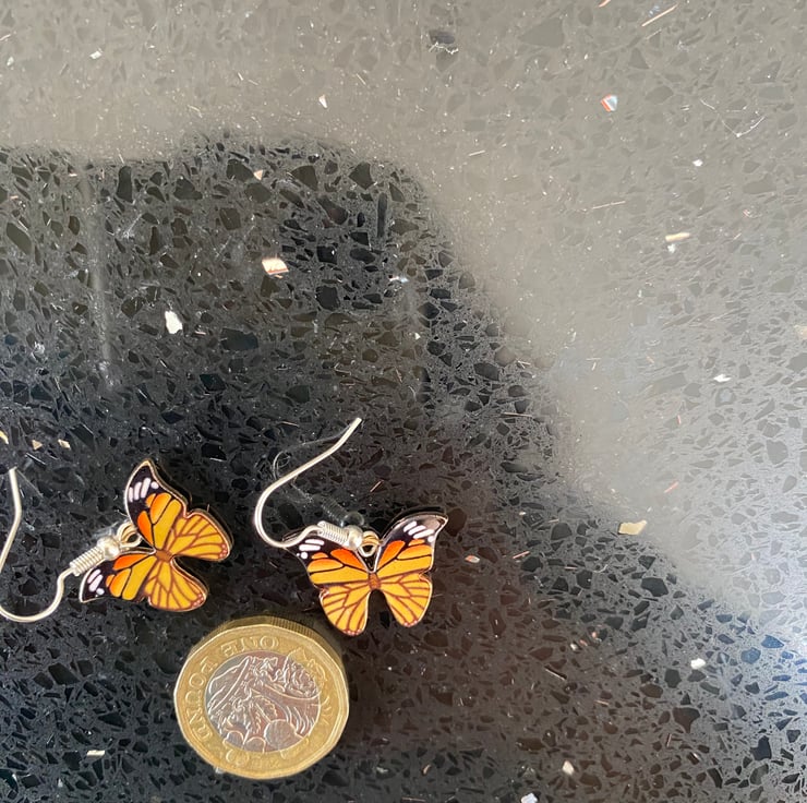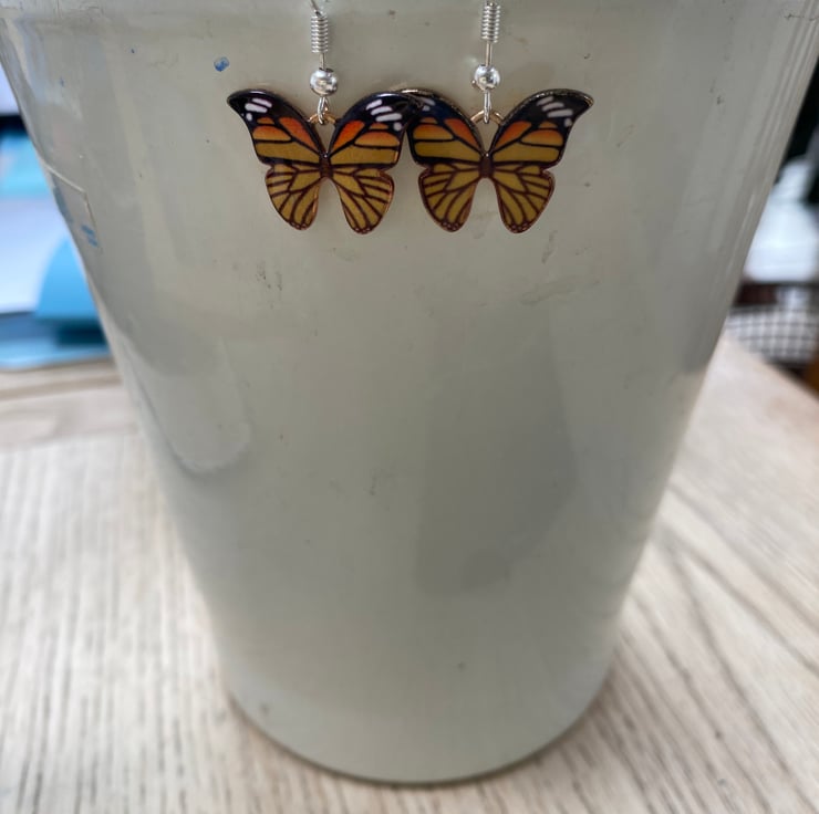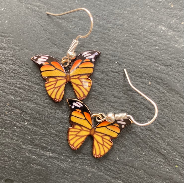 Attractive pair of orange enamel butterfly earrings that would make a great small gift or stocking stuffer for a nature lovers. The butterfly measure 20mm x 14mm and are mounted on hypoallergenic plated metal ear wires. Wide selection of earrings are available (please check out my shop for various designs).
