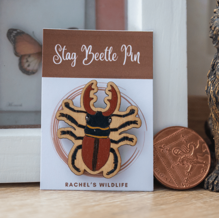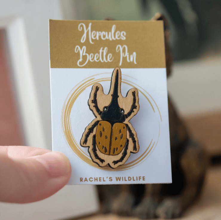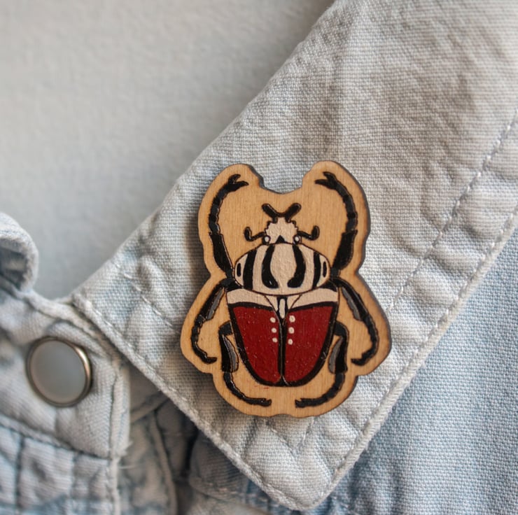 Celebrate the strength and splendour of the beetle kingdom with this handcrafted set of three wooden pins.
