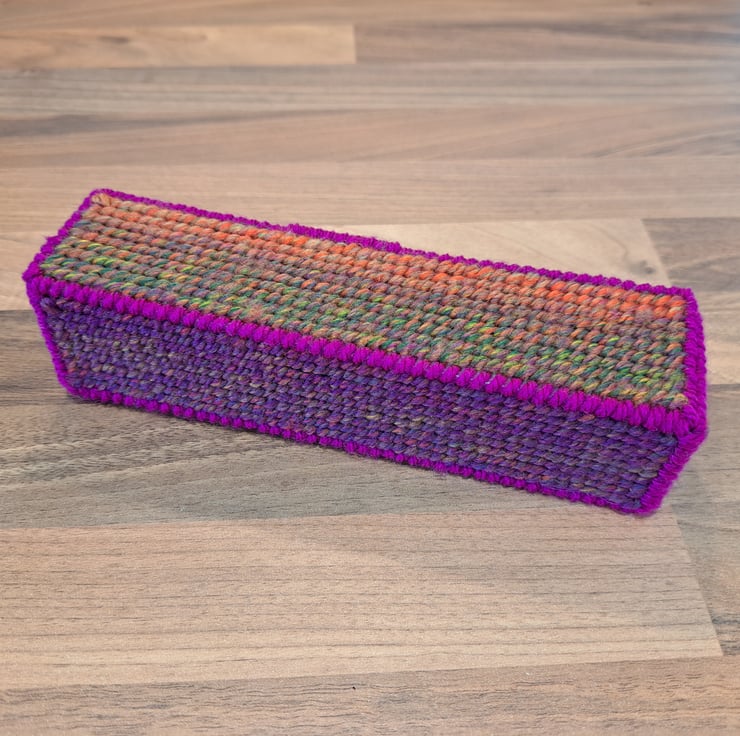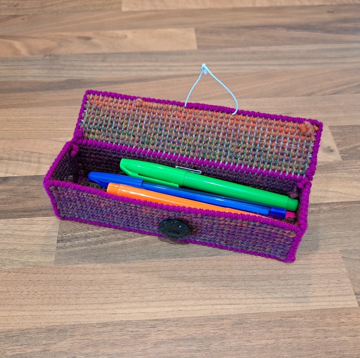 Cuboid pencil case with a mix of autumnal colours (green, orange, purple, yellow), magenta edging, dark green button with elastic closure and lid. Can store around 9 pens.