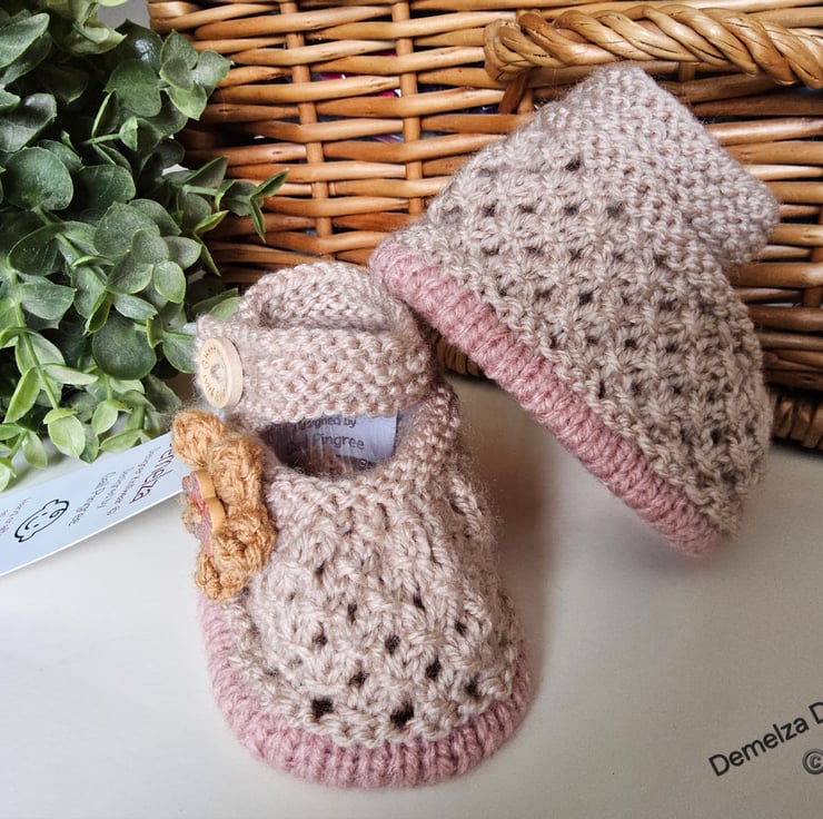 A beautiful pair of unique baby girl's knitted shoes designed and totally hand crafted in Cornwall. They have been created from branded machine washable premium acrylic yarns. The large puffy flowers have been hand crocheted complimented with genuine wooden flower shaped buttons in the centre. The shoe straps also have wooden buttons with a sweet sentiment burnt etched on them. The total time from start to finish took over three hours to lovingly create these shoes. On the inside of one shoe the luxury woven soft damask garment label has the care instructions on the reverse side.
