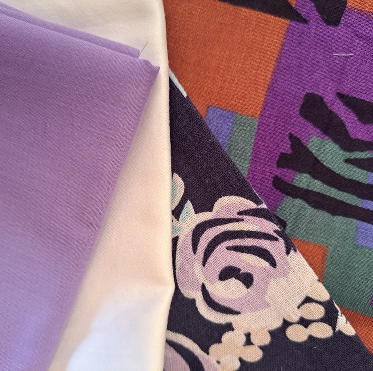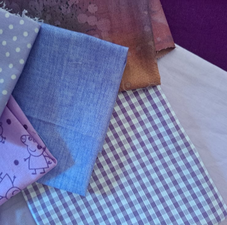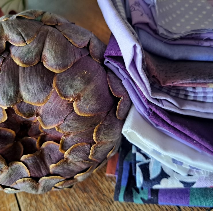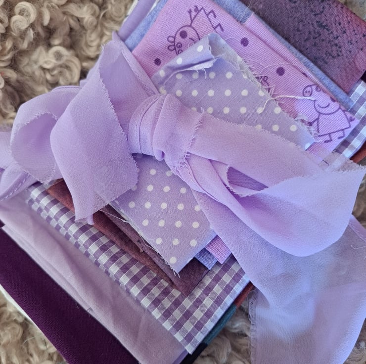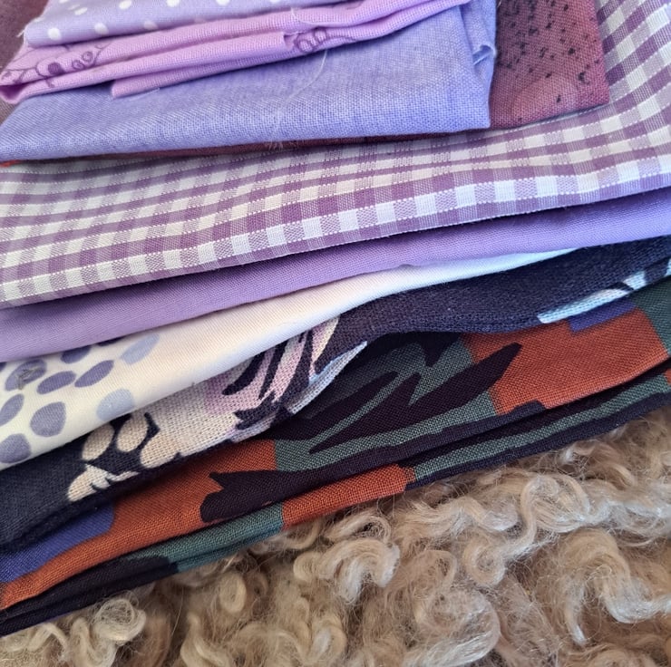 Eleven assorted purples - two of them linen and one, I think, polycotton. These rich-hued fabrics are nearly all new or remnant pieces. The colours range from soft lilac to a strong dark purple - and maybe even artichoke.
