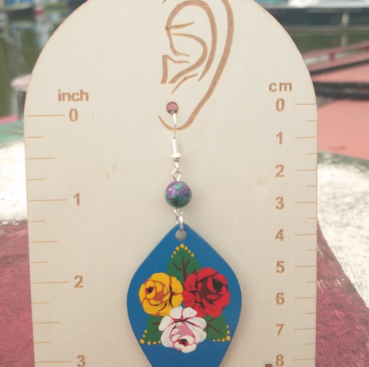 These lightweight wooden earrings are handpainted in the traditional style of the British canals.