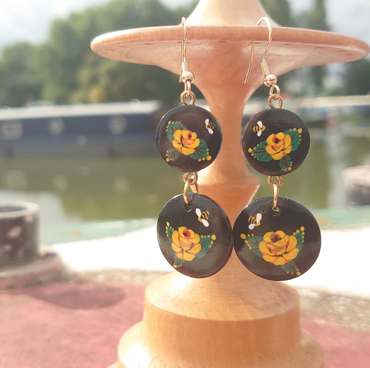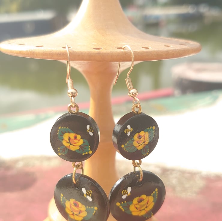 These lightweight wooden earrings are handpainted in the traditional style of the British canals.