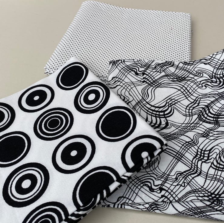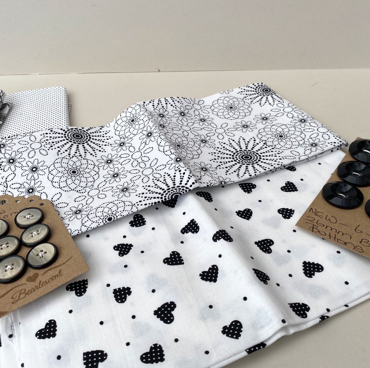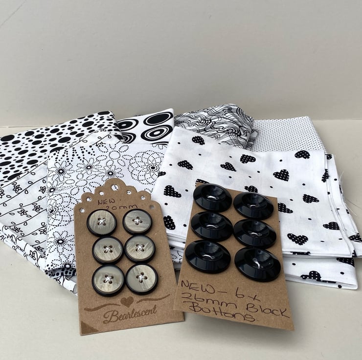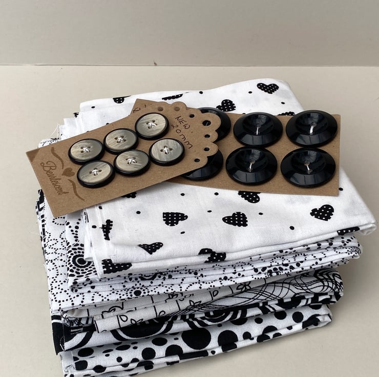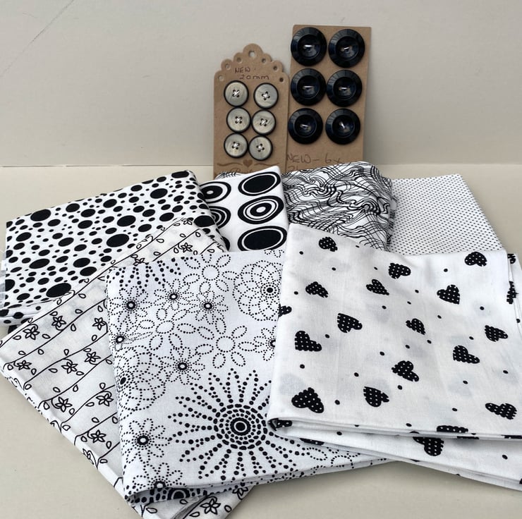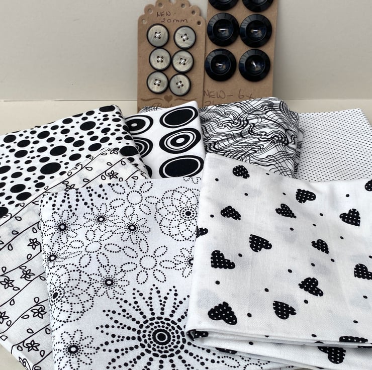 Bundle of 7 New fat quarter cotton fabrics in black and white with 2 button cards