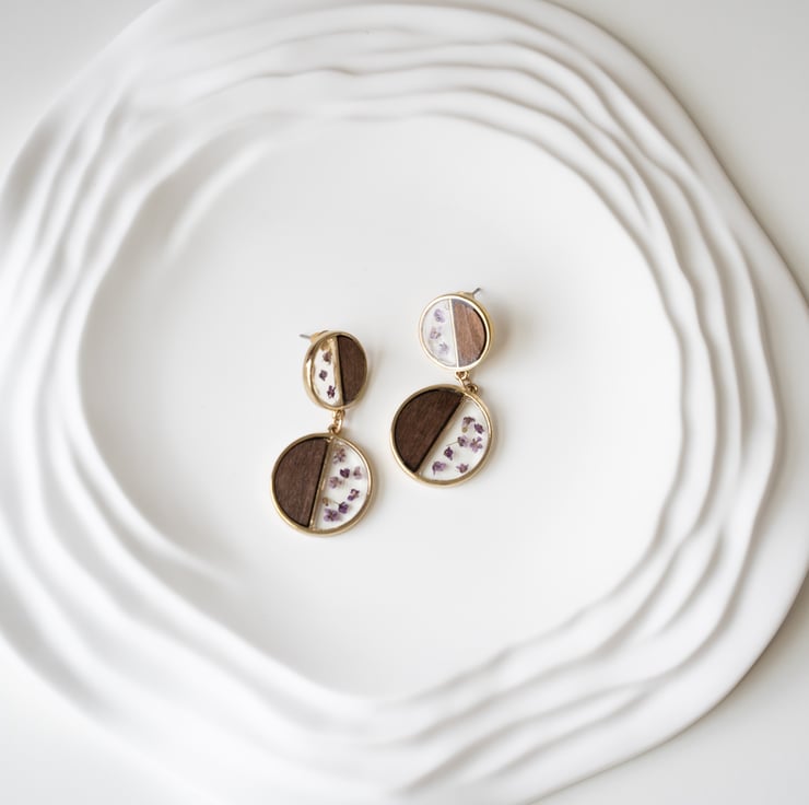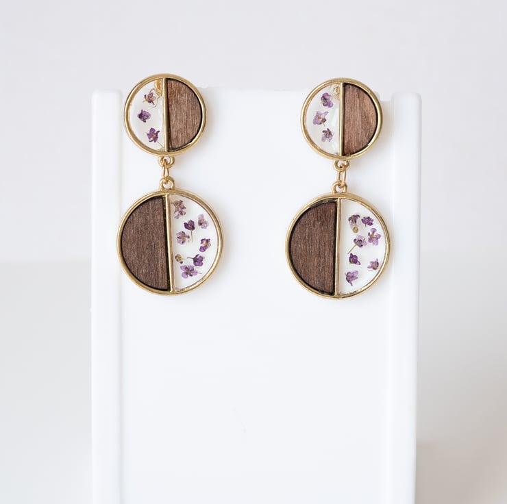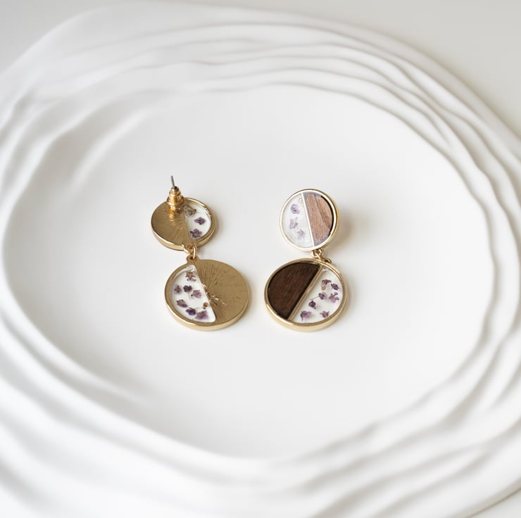 These unique handmade boho earrings combine natural wood, real dried flowers, and crystal-clear resin in a modern geometric design. The round two-part form features a warm wood half paired with a floral resin half, creating a beautiful contrast of textures and tones.