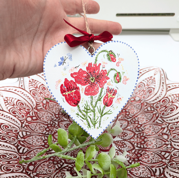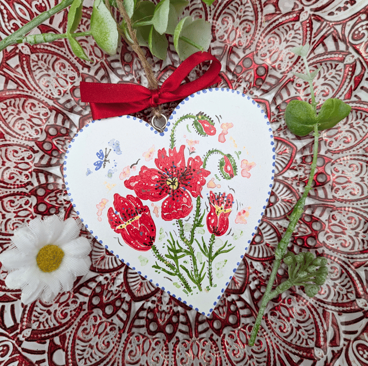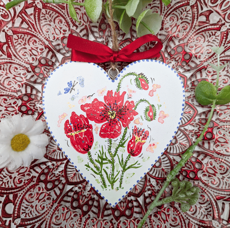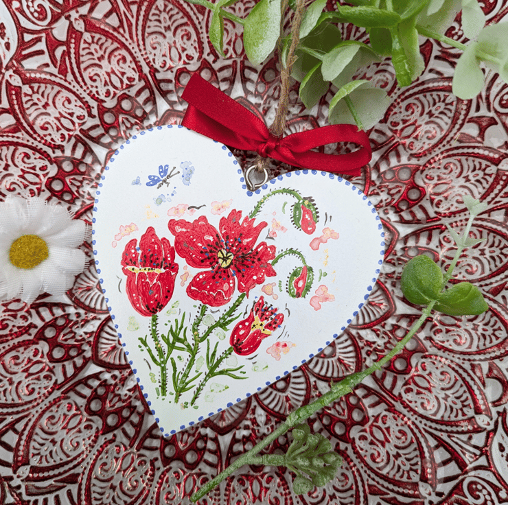 A beautiful hand-painted Poppy wooden heart ornament. Lovingly hand-painted in acrylics and varnished with a gloss varnish.