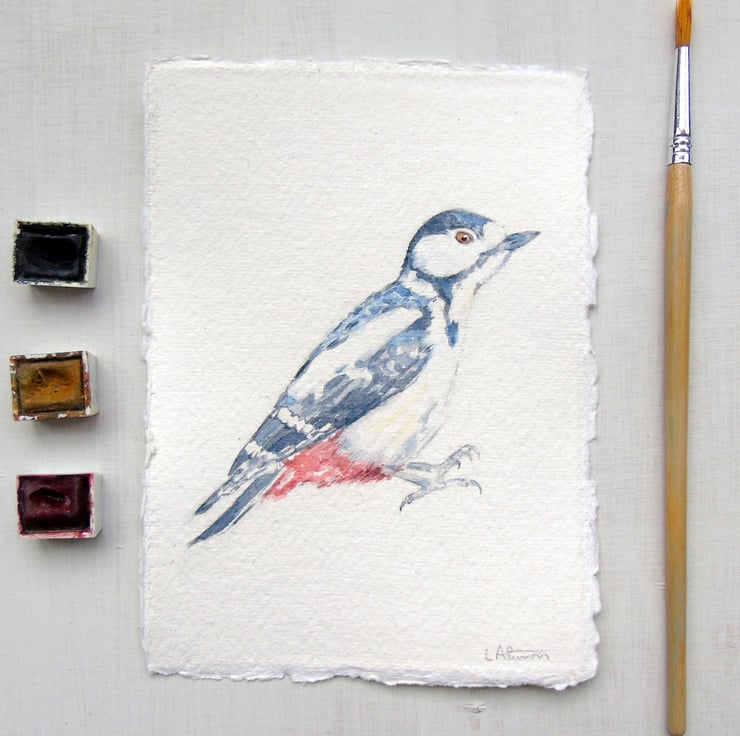 Unframed original watercolour painting of a great spotted woodpecker who is always one of the first and frequent to the peanut feeders at the bird hide. One of a set of four original paintings inspired by visits to a bird hide near Bamburgh in Northumberland.