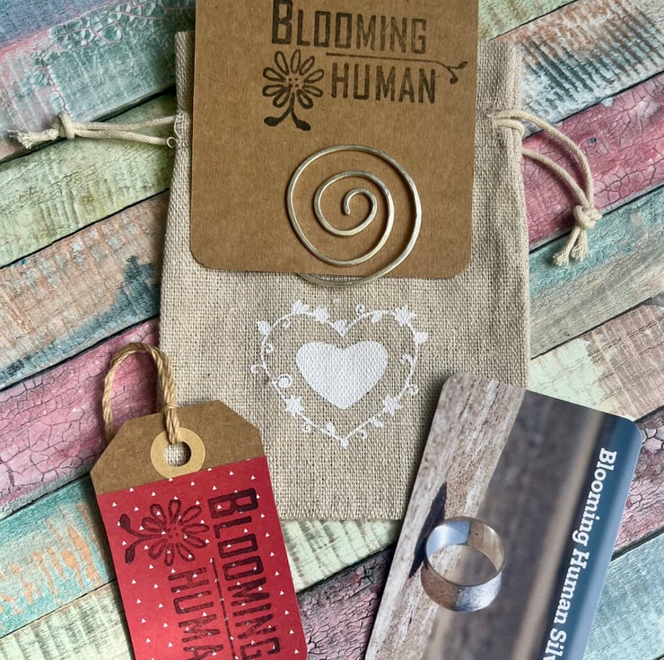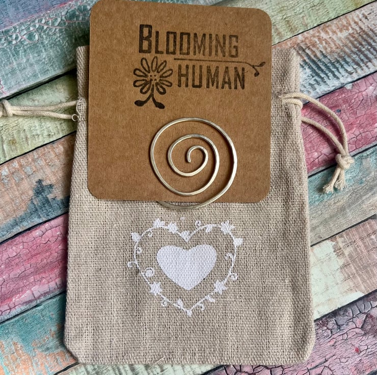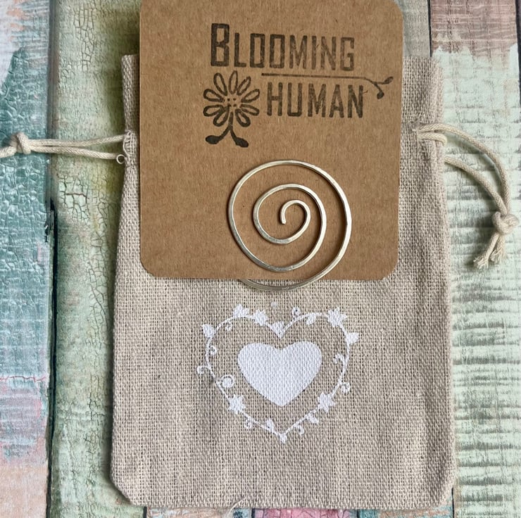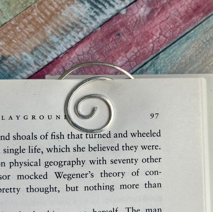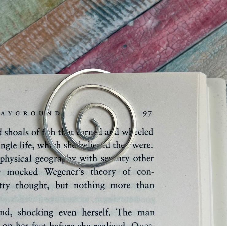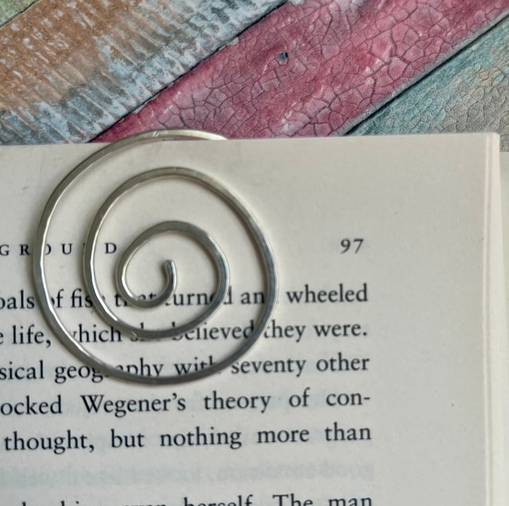 This is a beautiful spiral bookmark, hand crafted from solid recycled Sterling Silver 925. I have lightly hammered it by hand on one side so it catches the light, then polished it to shine. The simple spiral design reminds me of a winding journey or path, and it gives the bookmark its spring to hold the page.