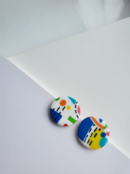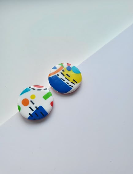 Brighten your day with these captivating abstract round stud earrings. Each stud boasts a dynamic and colourful design, featuring splashes of blue, green, yellow, red, and orange, interspersed with sharp black lines and dots. The vibrant artwork is set on a pristine white and turquoise background, creating a fresh and contemporary look. These studs offer a comfortable fit and are the perfect accessory to infuse your style with a playful burst of colour and artistic expression. Ideal for daily wear or to add a distinctive touch to your ensemble.