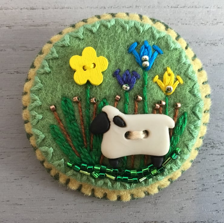A Sheep button is sewn onto circles of green and cream felt, with hand embroidered sapphire blue flowers and green grasses, decorated with golden, bronze, green and peridot seed and bugle beads. The brooch is edged in dark green Blanket Stitches.
