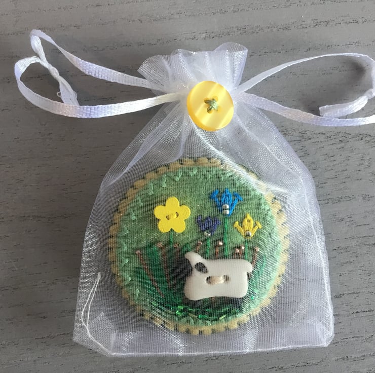 This Hand Embroidered Pennine Sheep Brooch is gift wrapped in an organza bag, decorated with a yellow button. Ready for a birthday, thank you or friendship gift. It’s light to post for a letterbox gift.