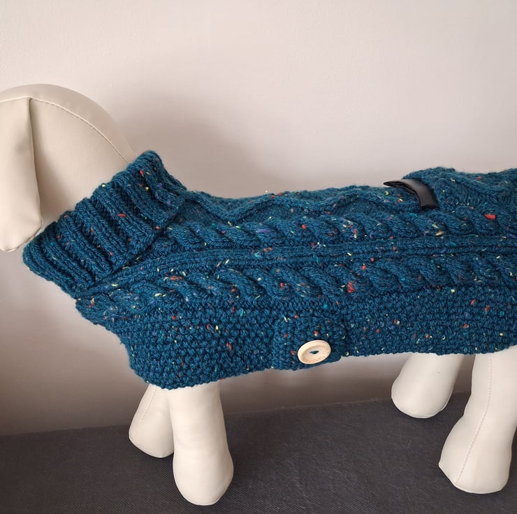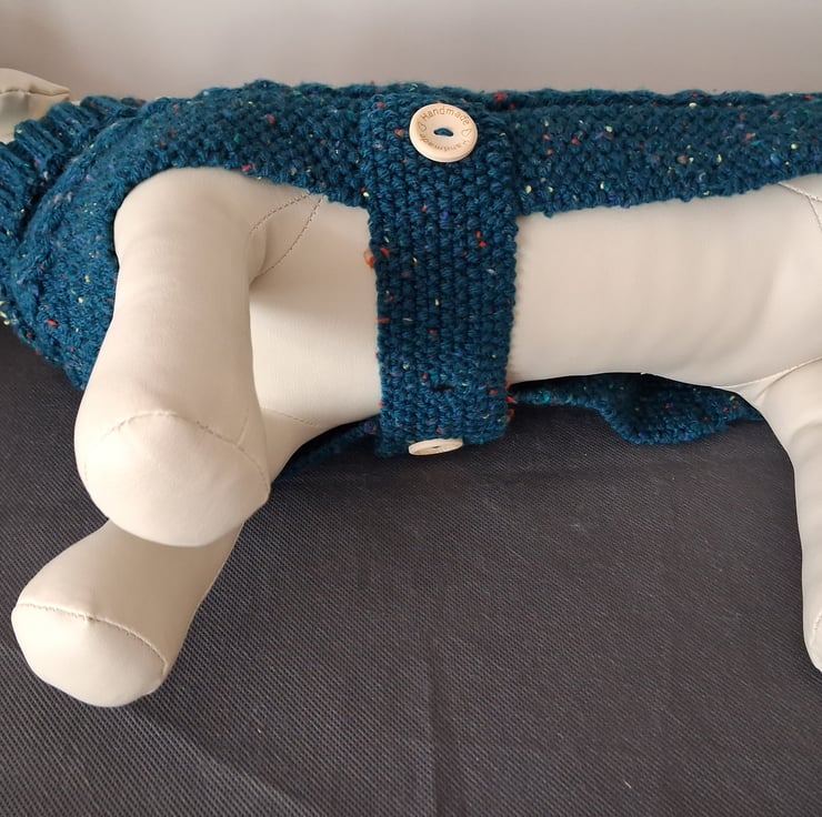 This is a hand knitted dog coat. Knitted in really lovely teal coloured wool and acrylic Aran yarn. The yarn has flecks of orange and green. There is a gap at the neck for the lead and new to the shop is the introduction of a small pocket at the end of the back which contains two poo bags. The coat pulls over the head of the dog and then fastened with two wooden buttons and a strap. There are three buttonholes which helps to make the coat a snug fit. The buttons have Handmade and Hearts on them.