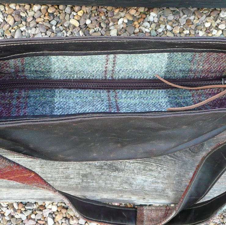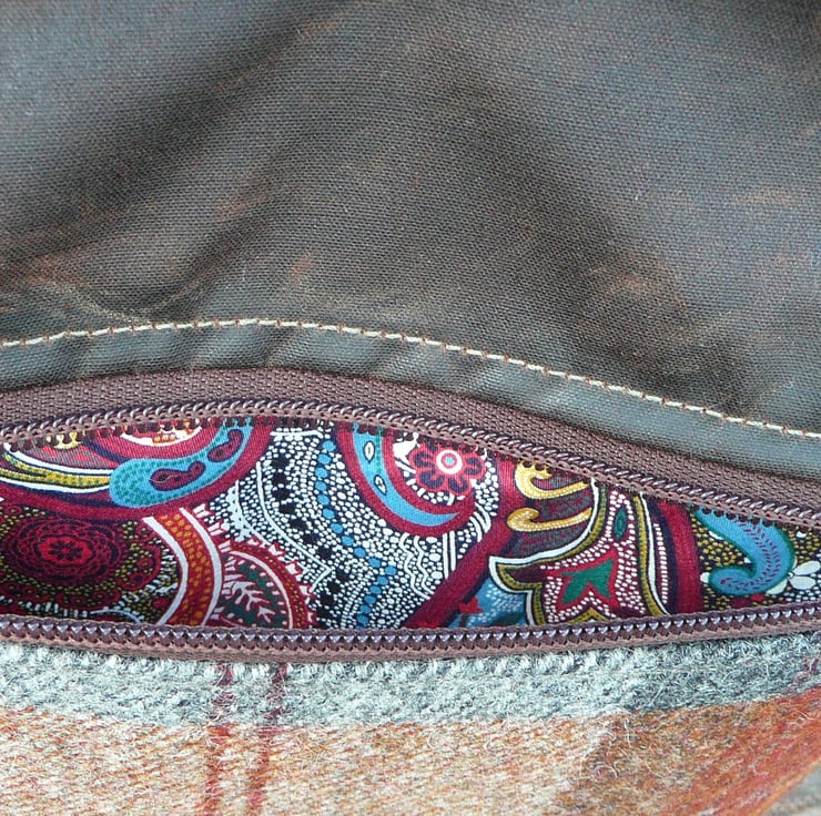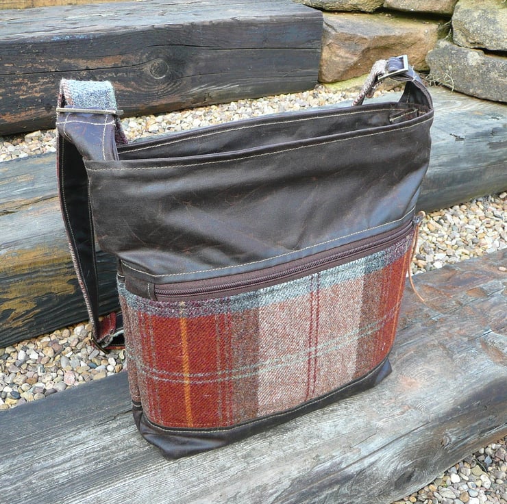Made from dark brown heavy wax cotton canvas and a Scottish wool tweed, ( Not Harris ) this bag boasts a zip top fastener, an adjustable crossbody / shoulder strap and a large front zip pocket. Inside you will find a slip pocket and a zip pocket.