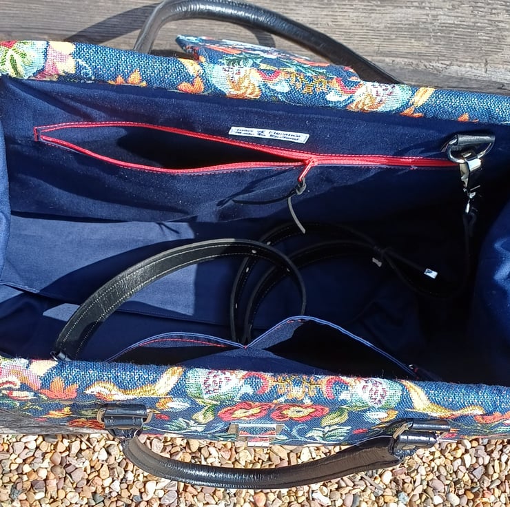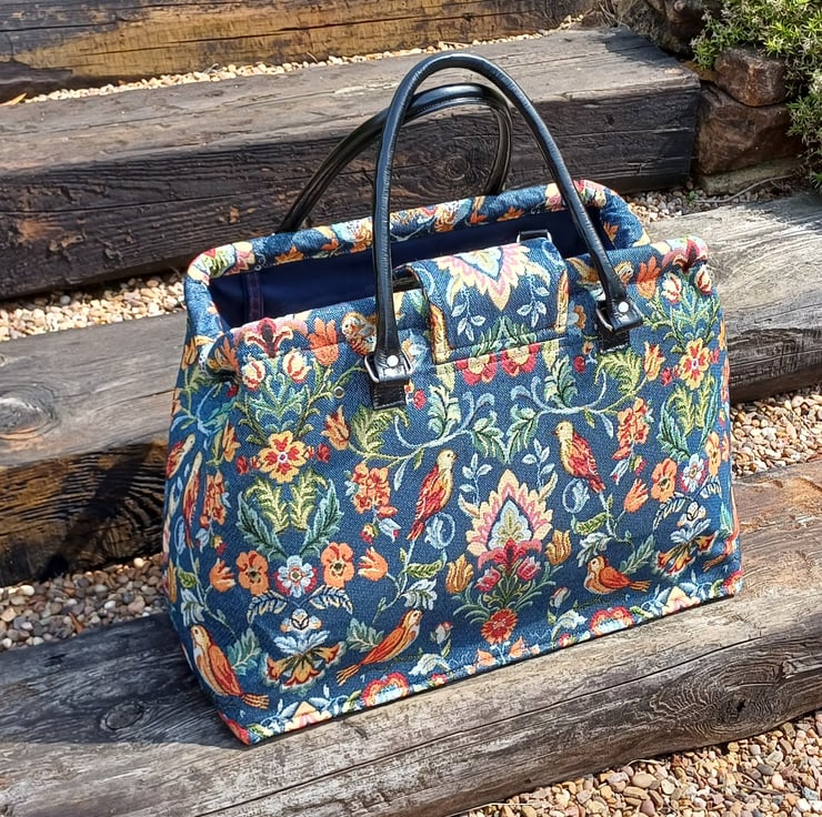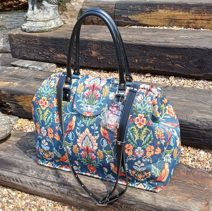 Made from a blue William Morris style tapestry fabric, ( NOT actually William Morris fabric ) This large weekender travel bag features a semi solid bag base with bag feet, black handcrafted real leather carry handles and detachable shoulder strap, and a twist bag lock on the front. This bag has an internal spring loaded bag frame therefore it " pops " open and " snaps " shut, it is made with lots of heavy duty interfacing and bag foam to give the bag structure and durability, and it will stand upright on it's own.