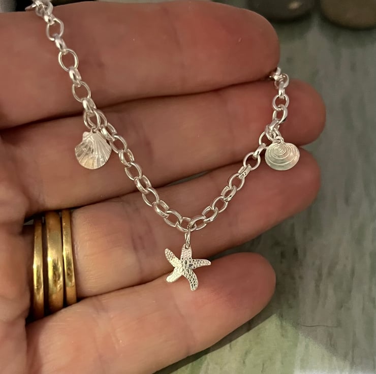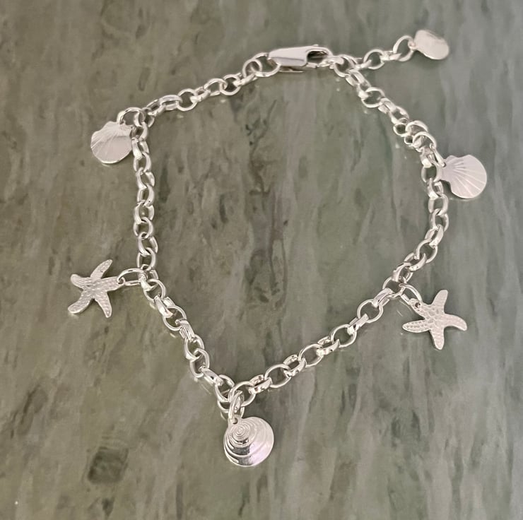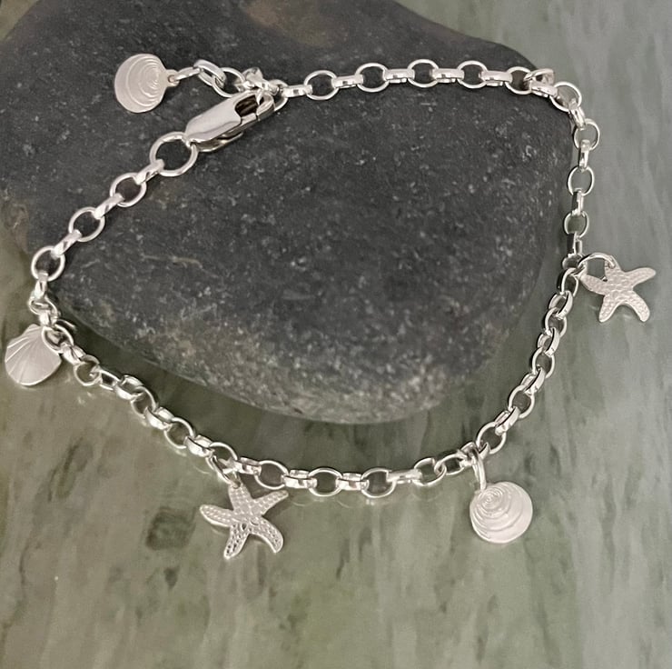 A simple belcher chain bracelet with six individually handmade sea shell and starfish charms.
