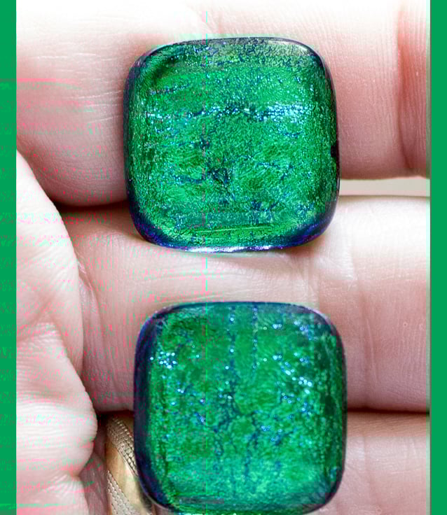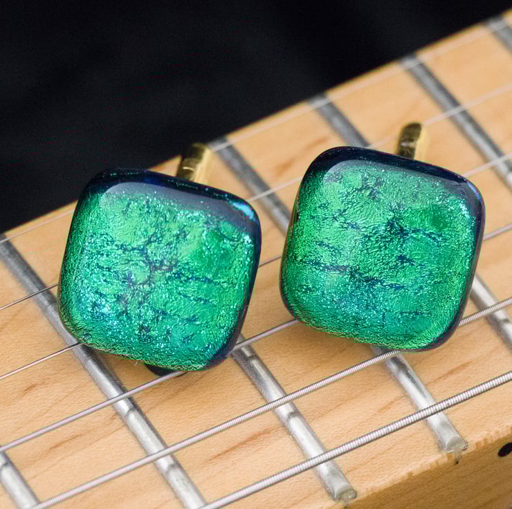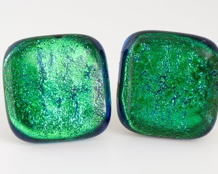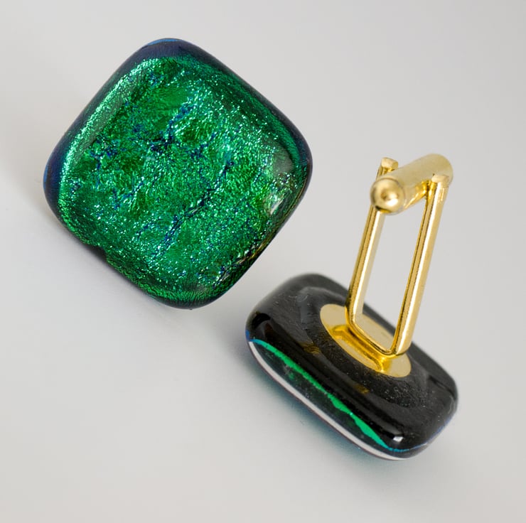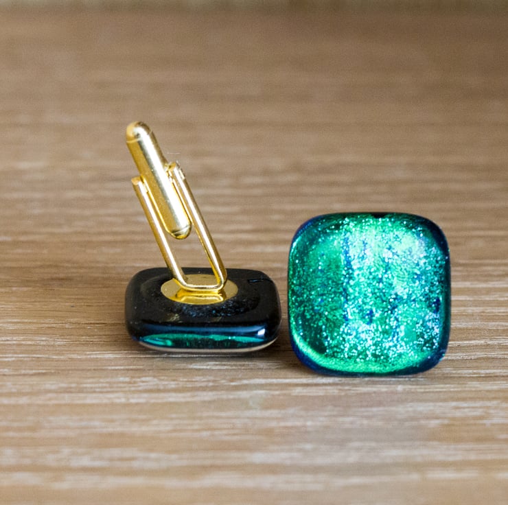 These Cufflinks are made up of two 2cm squares of Dichroic glass, each capped by a piece of clear glass and fused in the kiln. Each is mounted on a gold-plated fitting.