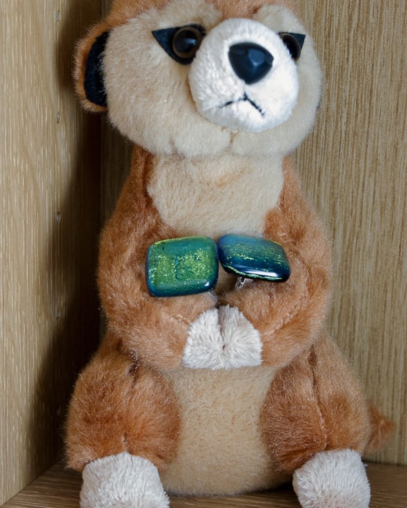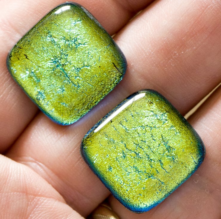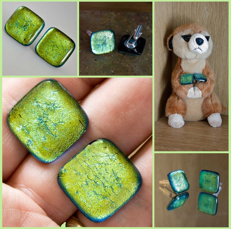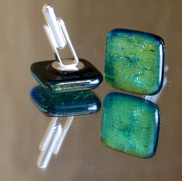Our Cufflinks are all made using two 2cm squares of Dichroic glass, each capped by a piece of clear glass and fused in the kiln. Each is mounted on a silver-plated fitting.