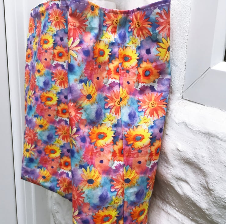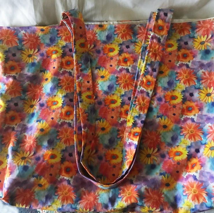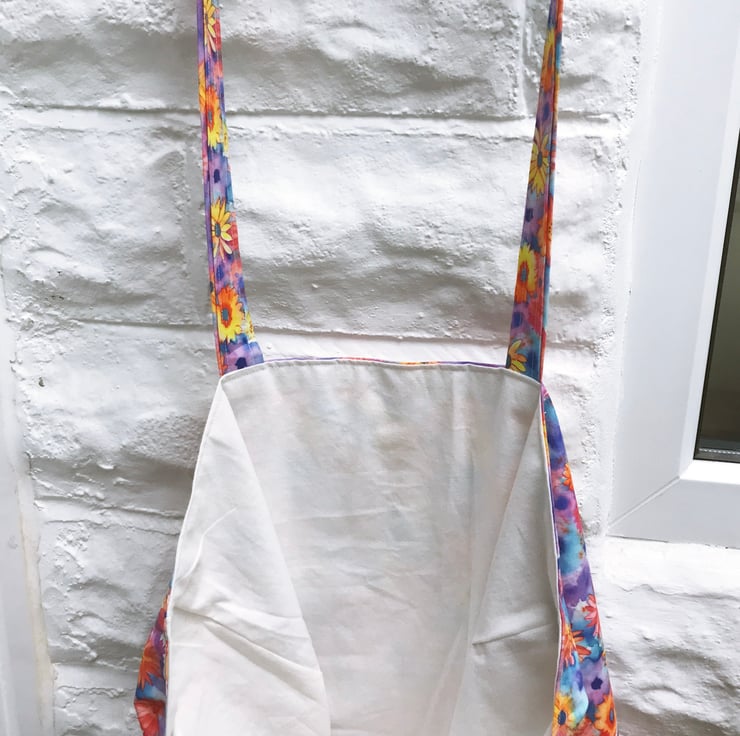 Shoulder bag, handmade from yellow floral print cotton fabric.