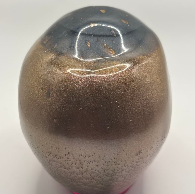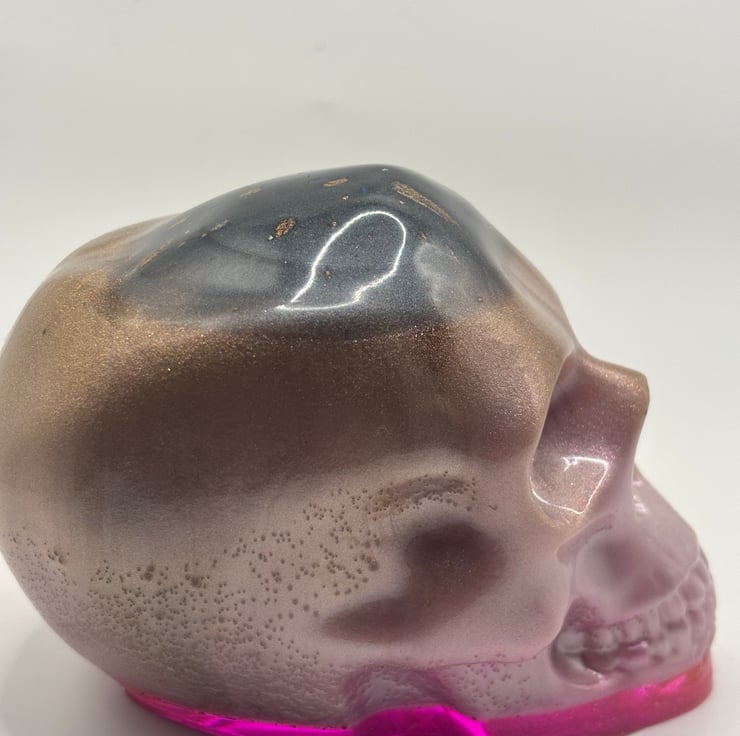 Pink shimmery skull ornament made with epoxy resin, mica powders, glitter and neon alcohol ink.