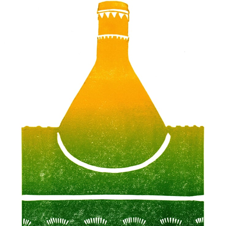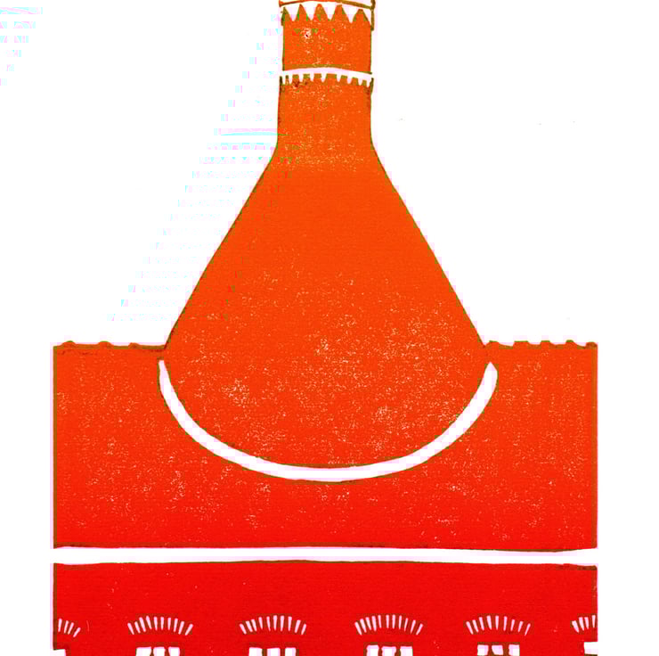 This is a single stage linocut print designed, hand-carved and hand-printed by me, of the historic bottle oven at the Heron Cross pottery in Stoke-on-Trent. The image is roughly A5 and the paper is just smaller than A4. It is printed by hand on Japanese Ho-Sho paper using Cranfield Caligo Safewash relief inks.