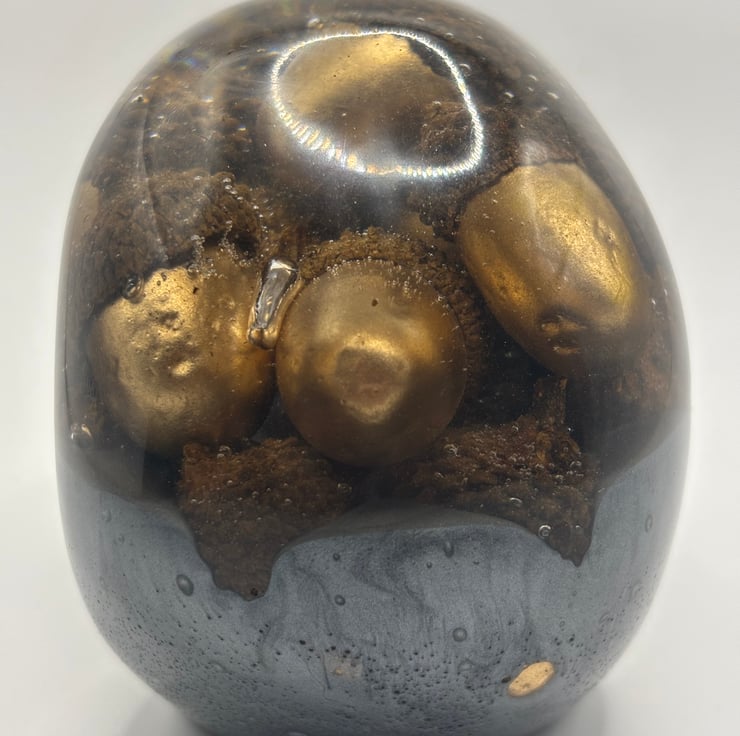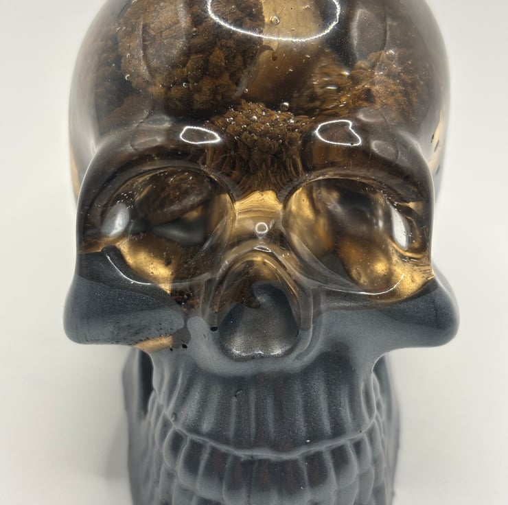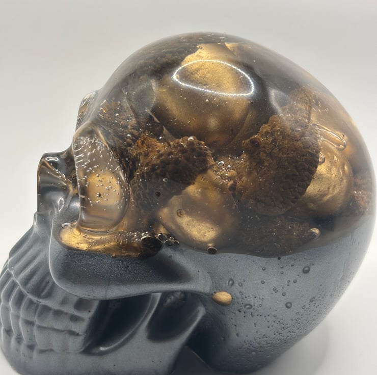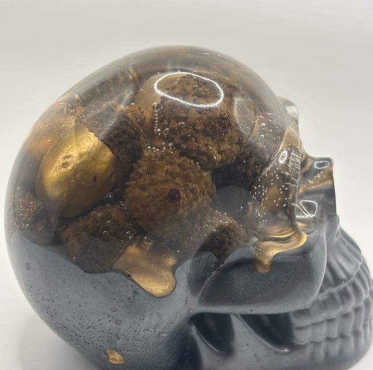 Beautiful resin skull with golden acorns and a dark silver coloured base