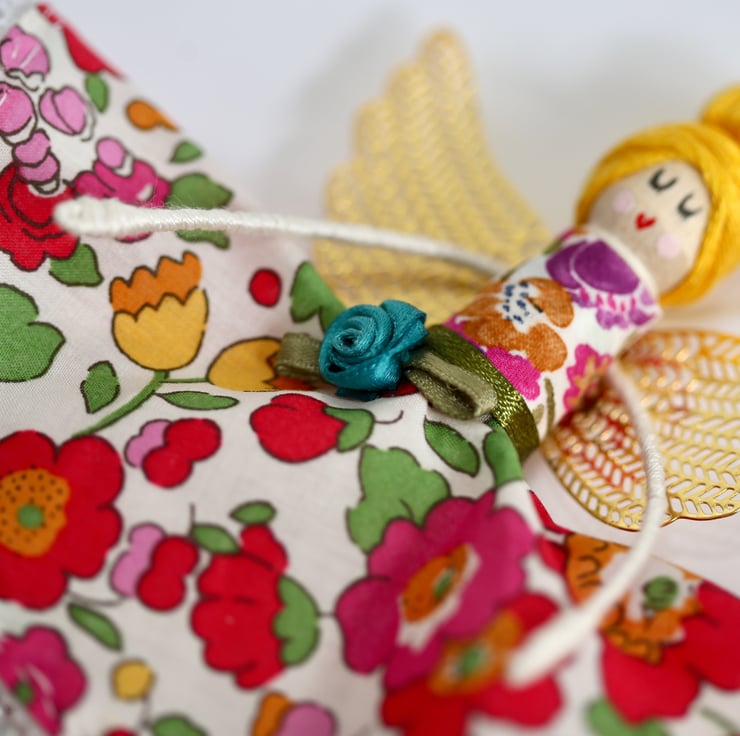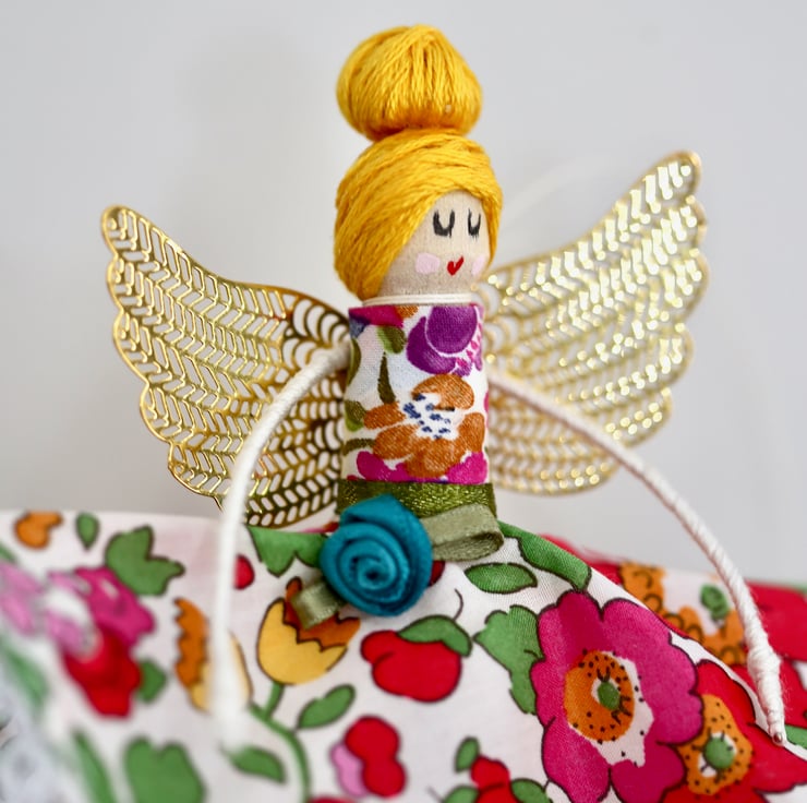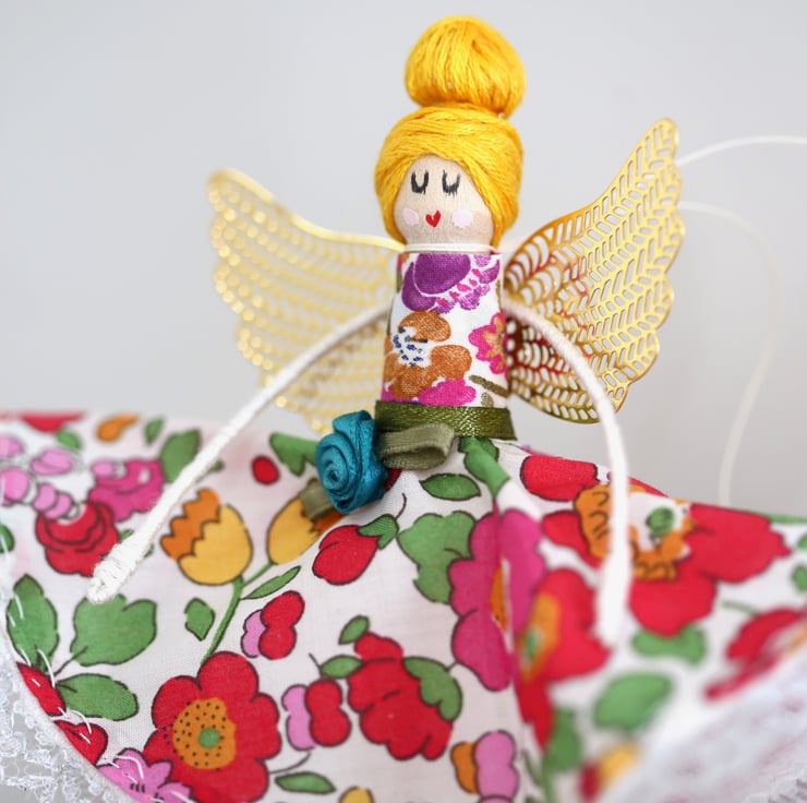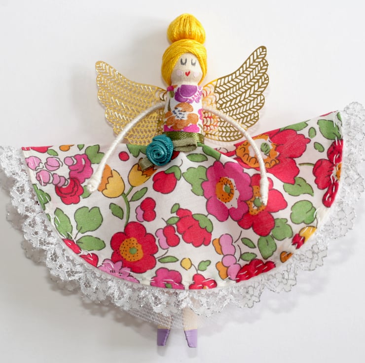 Hand painted shoes and face on the peg, lace trimming on the skirt, Liberty fabric around the bodice with ribbon and fabric flower attachment.