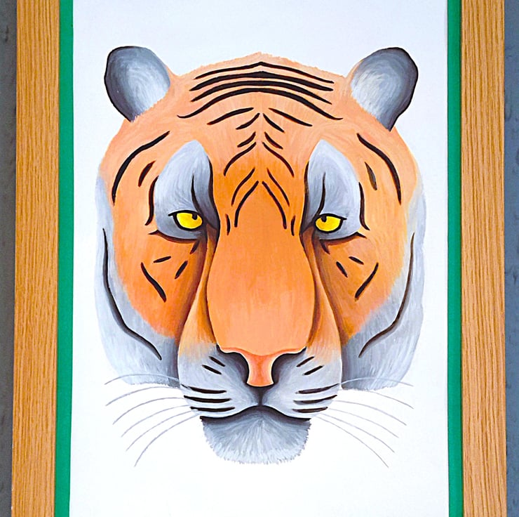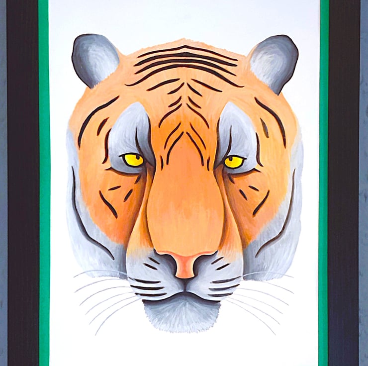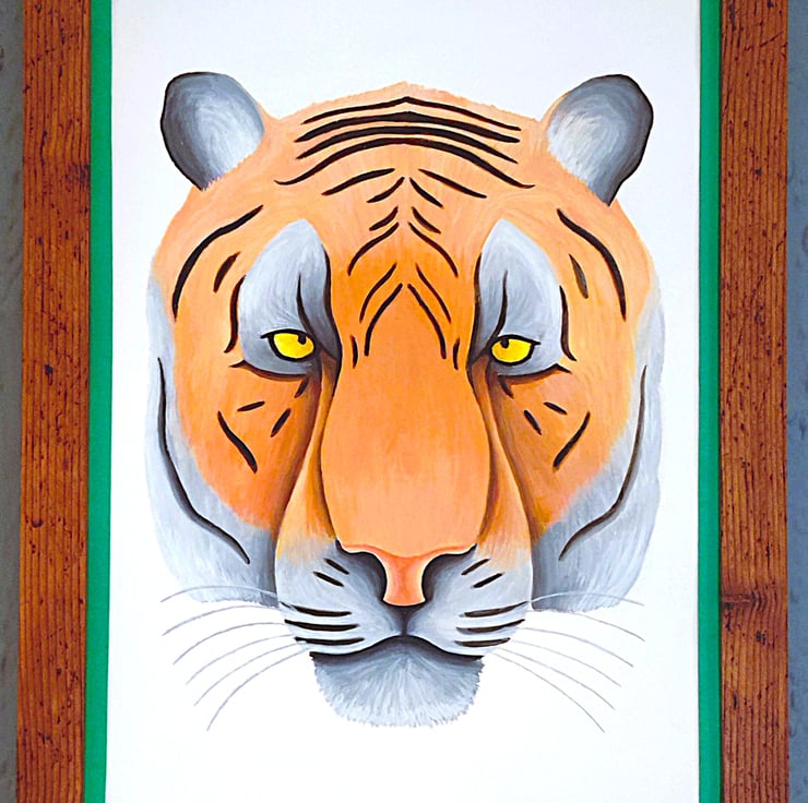 Framed high-quality coloured A3(42cm x 30cm) Giclee print of my painting of a tiger's head/portrait on a white background with a hard backing. The print comes finished with a stylish, contemporary dark green border. Framed with an expensive Styrene Protective Perspex (which has same clarity of glass) ready to hang. Buyer can choose from three types of frame; Black, Oak or Dark Oak. Colours of print with border may differ slightly due to computer/phone settings. All purchases delivered within 7-10 working days.