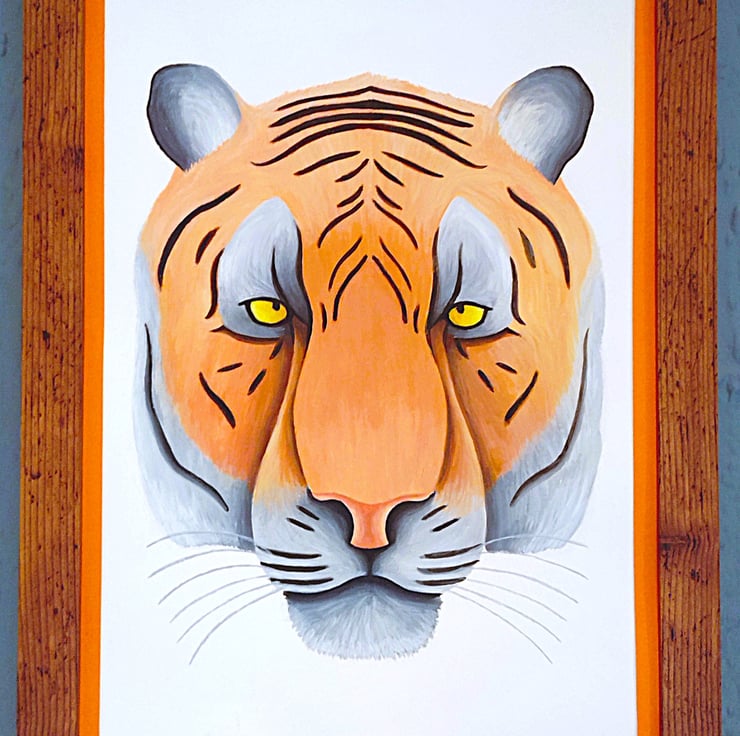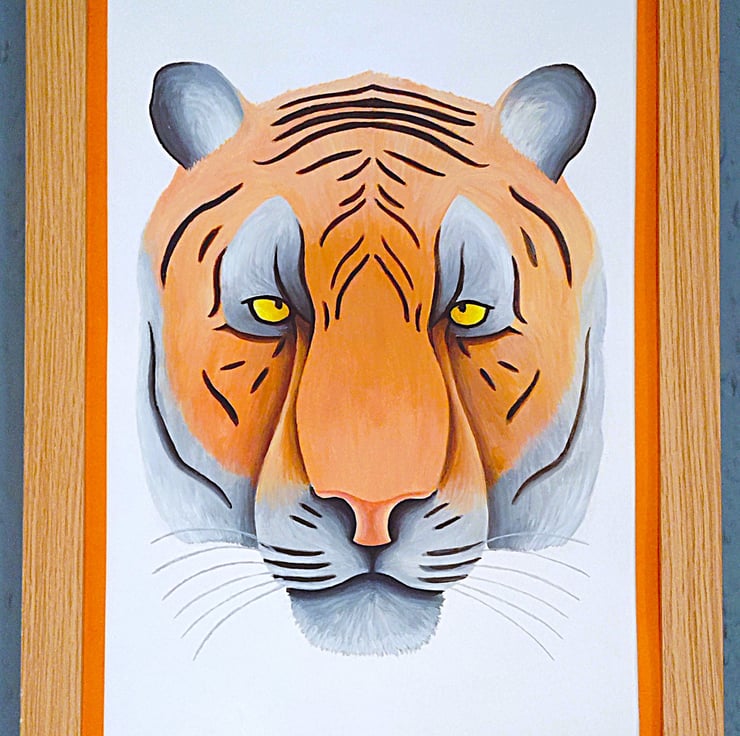 Framed high-quality coloured A3(42cm x 30cm) Giclee print of my painting of a tiger's head/portrait on a white background with a hard backing. The print comes finished with a stylish, contemporary orange border. Framed with an expensive Styrene Protective Perspex (which has same clarity of glass) ready to hang. Buyer can choose from three types of frame; Black, Oak or Dark Oak. Colours of print with border may differ slightly due to computer/phone settings. All purchases delivered within 7-10 working days.