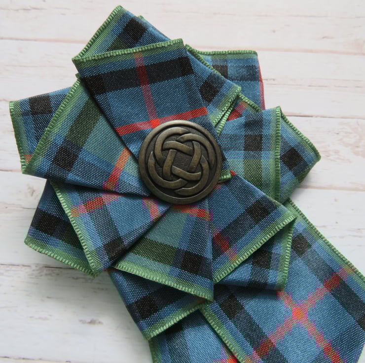 Made with a hand sewn ruffle of wider Flower of Scotland tartan ribbon with wide ribbon shaped trails and finished with a choice of a larger antique silver or bronze tone Celtic button