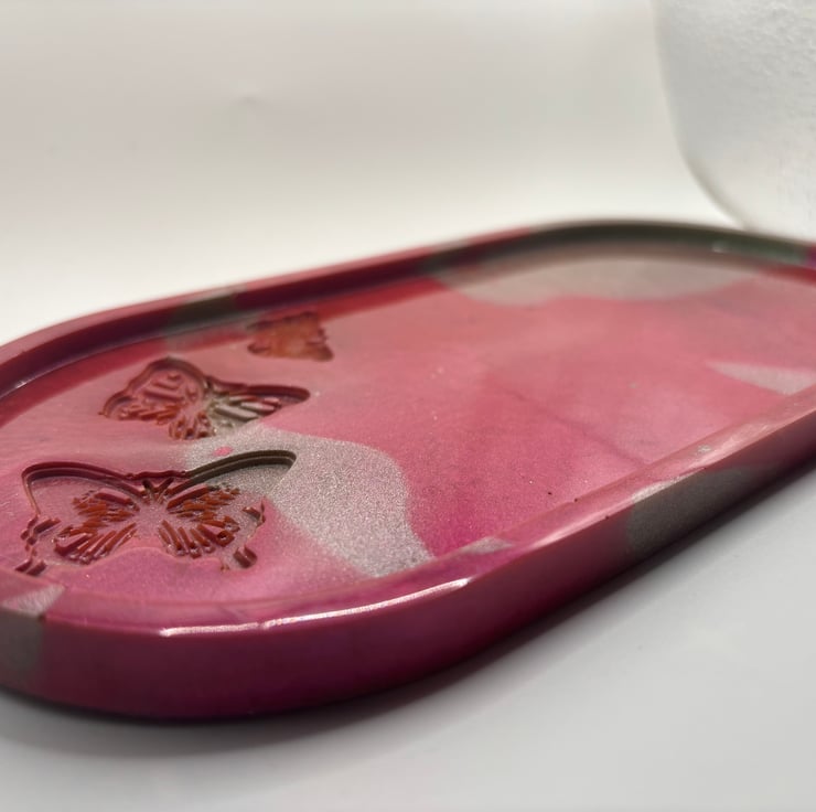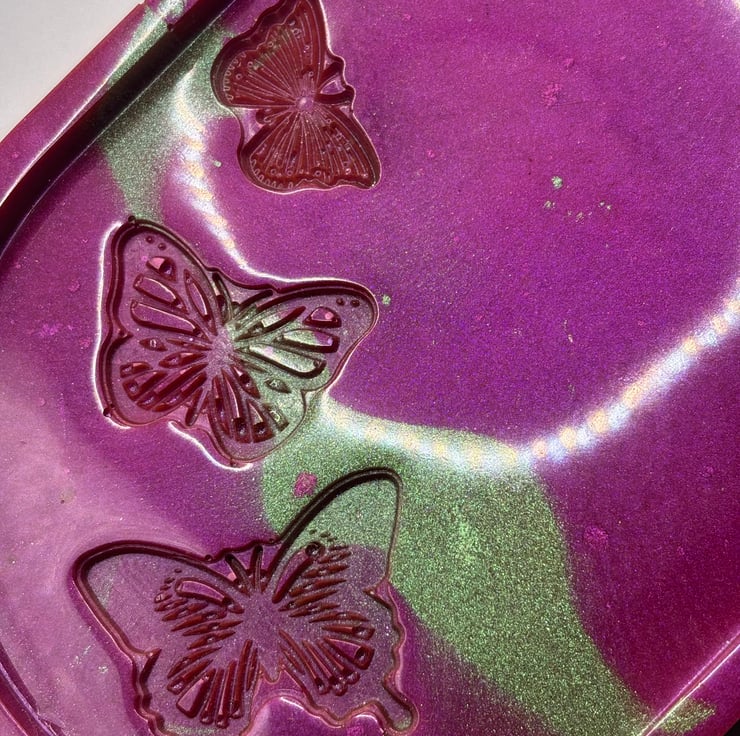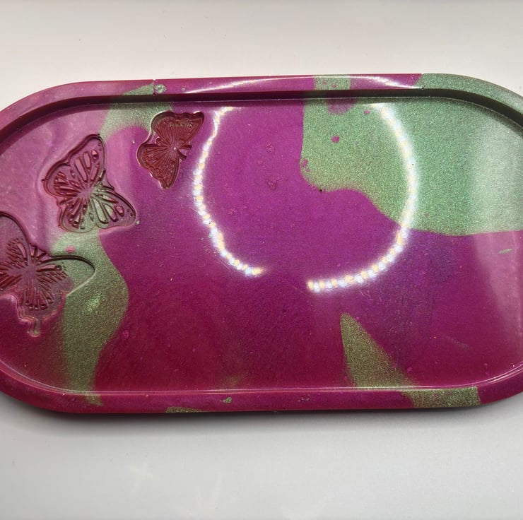 Beautiful pink and green butterfly tray made with epoxy resin and mica powders.