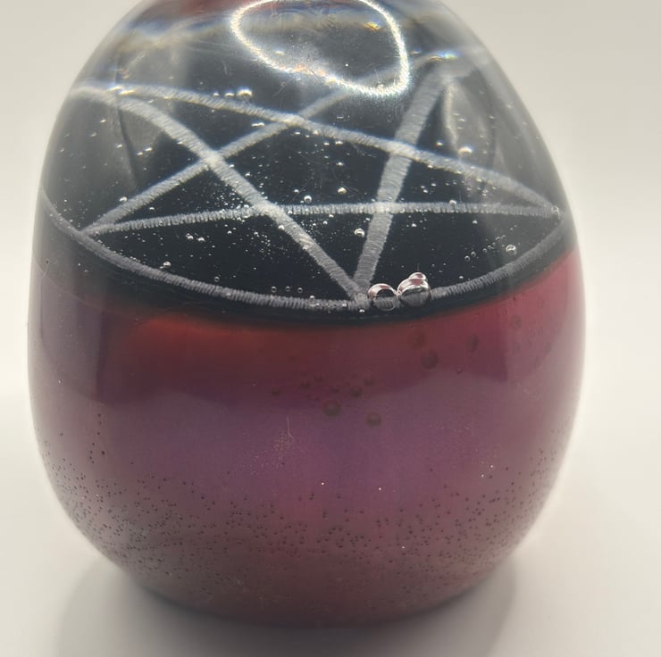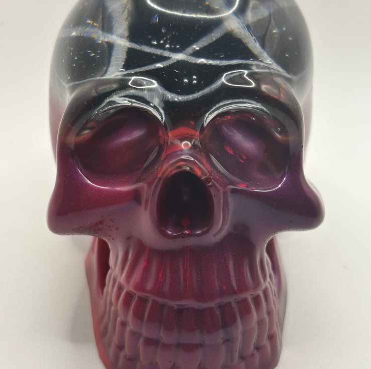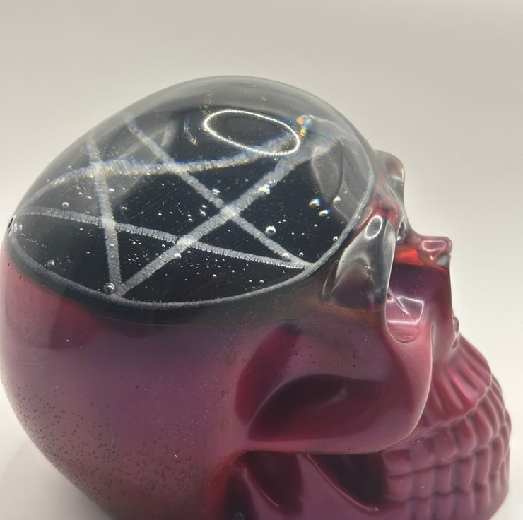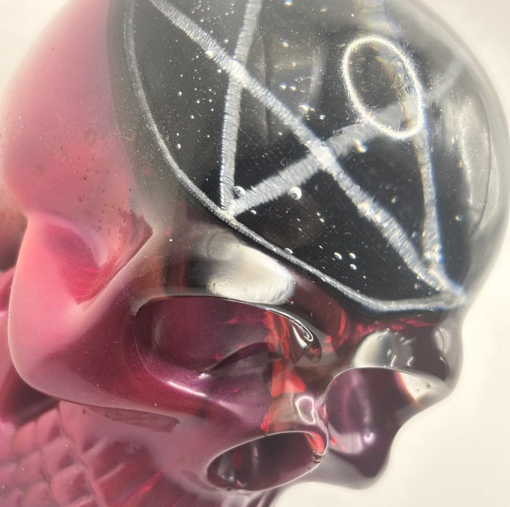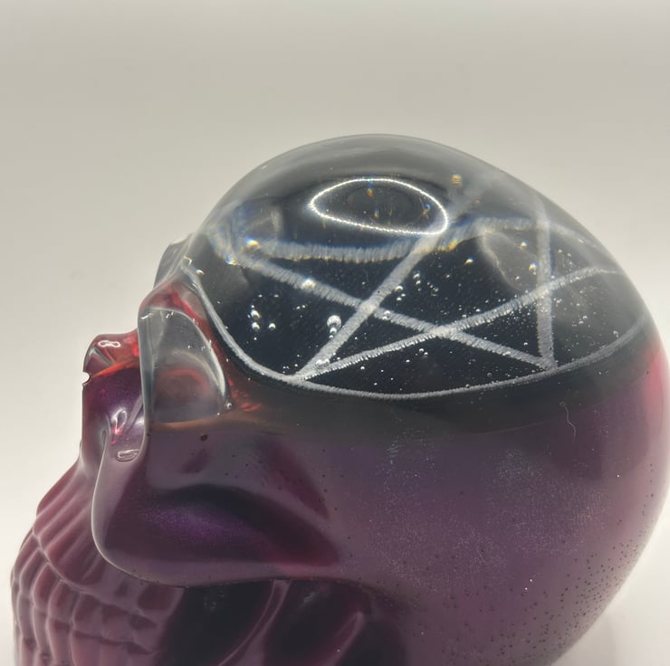 Skull ornament made with epoxy resin with a pentagram patch inside and a beautiful pink/purple base. The bubbles inside just add to the character of the piece