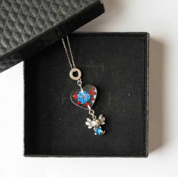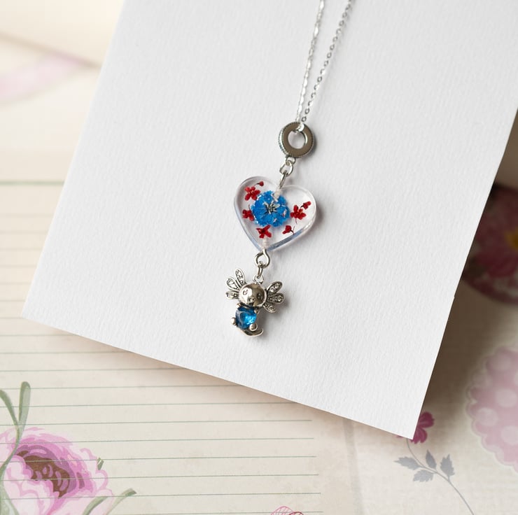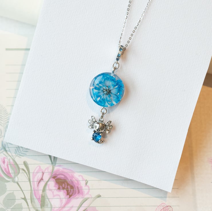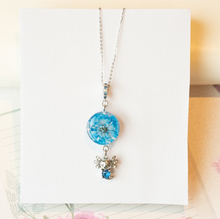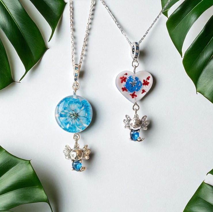 This adorable handmade necklace features a real pressed blue flower encased in crystal-clear resin, paired with a tiny silver axolotl charm. The chain and all metal components are genuine sterling silver, making it safe for sensitive skin and ideal for everyday wear.