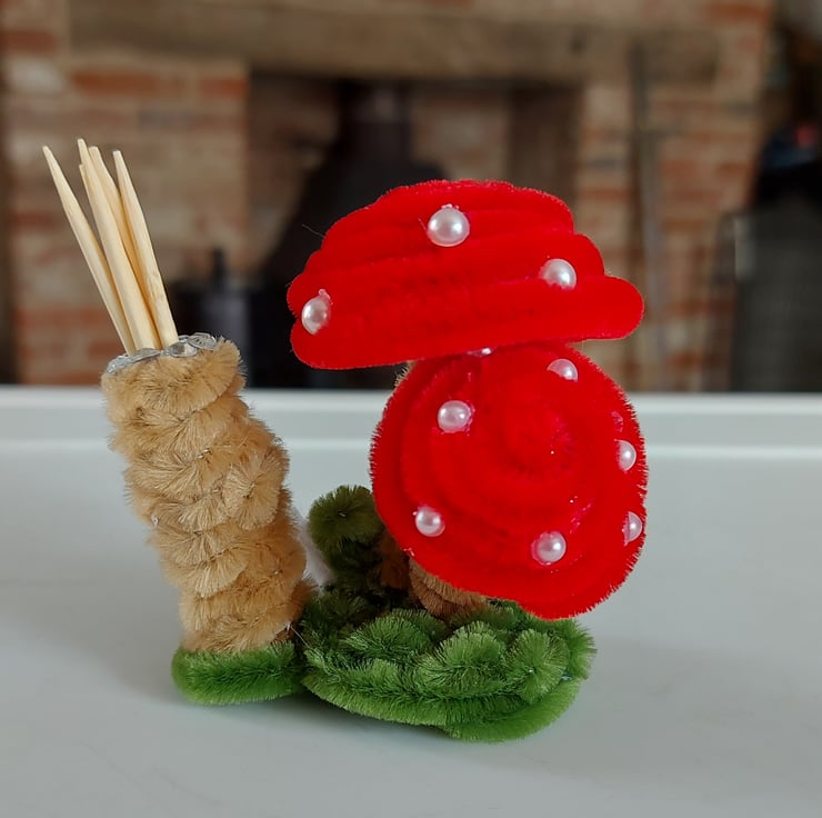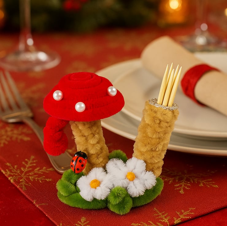 Add a touch of woodland charm to your table with this handmade mushroom toothpick holder! Made from soft pipe cleaners, it features a red toadstool with pearl accents, white flowers, and a ladybird. Perfect for cottagecore decor, party tables, or fairy garden lovers. Functional, fun, and totally unique!