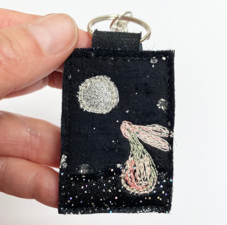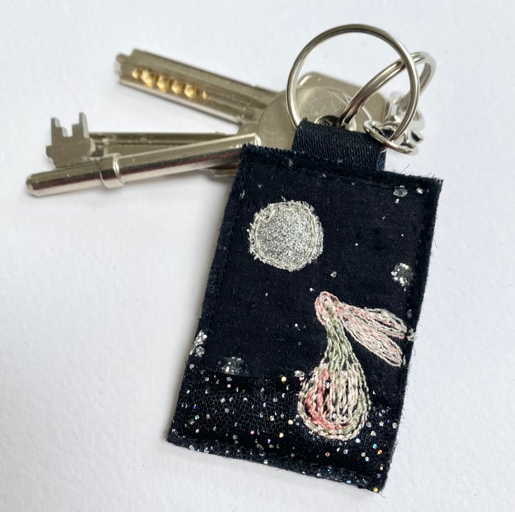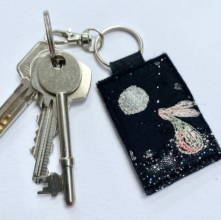 My adorable moon and hare keyring is made with up-cycled fabric. It’s plain in the back. It measures 6.5 x 4cm. With the split ring and lobster clasp the length is 11.5cm.