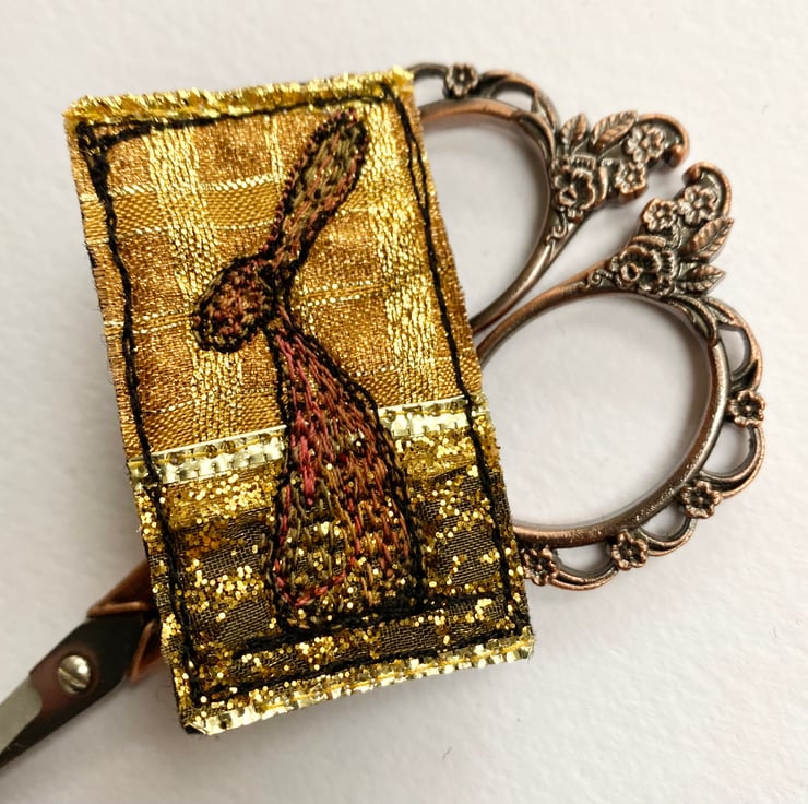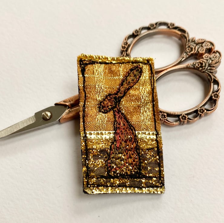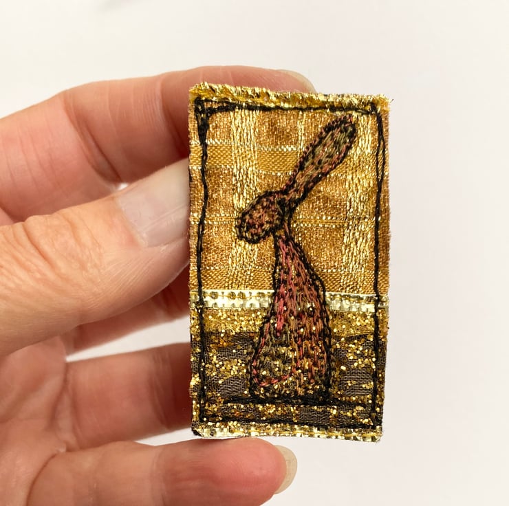 This charming handmade free motion embroidered golden hare brooch is made from up-cycled fabric. It is felt backed, and has a brooch pin with hook on the reverse to keep it nice and secure. It measures 3 x 5.5cm approx.
