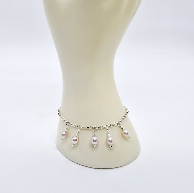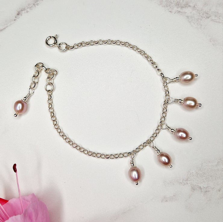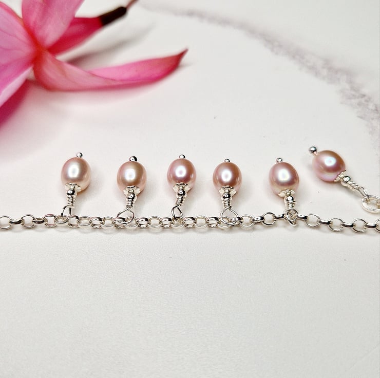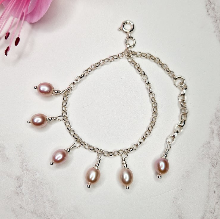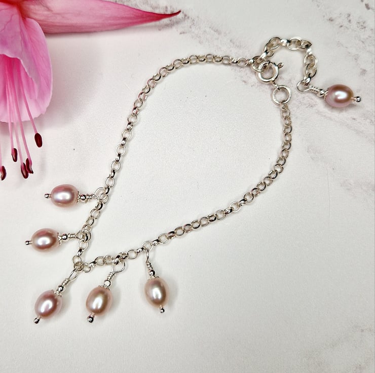 A silver chain bracelet with rose pearl drops.