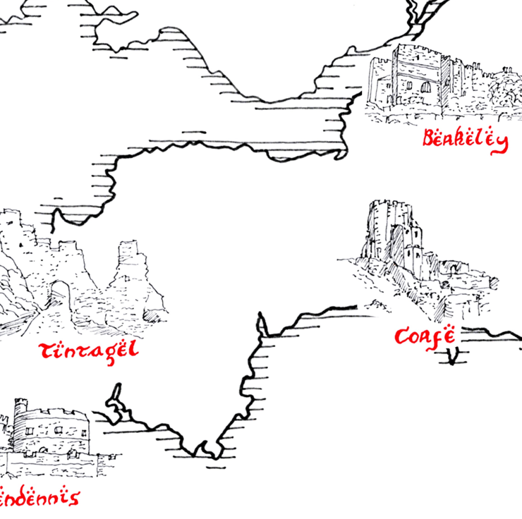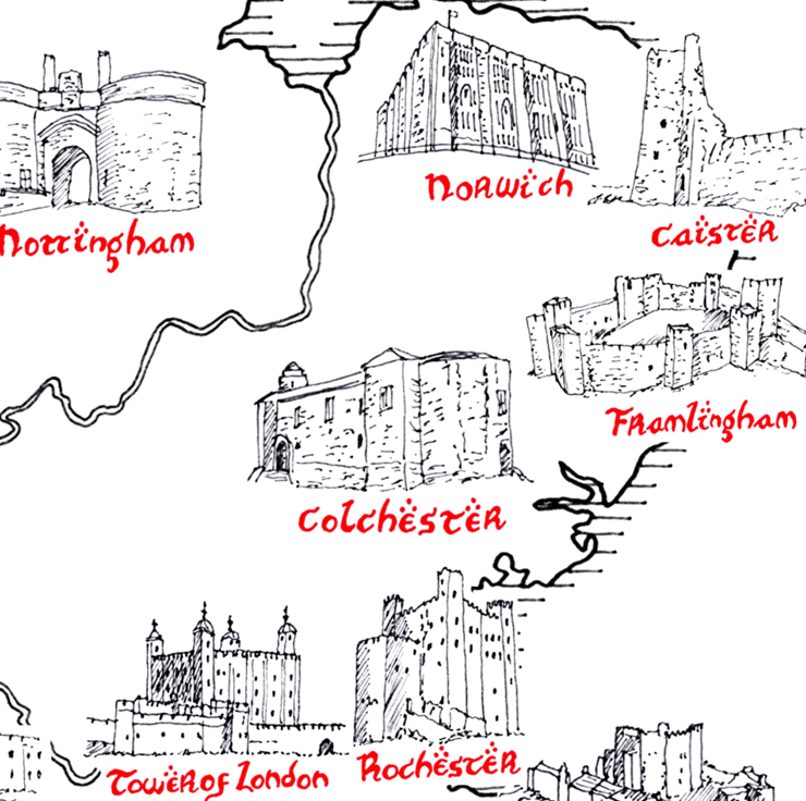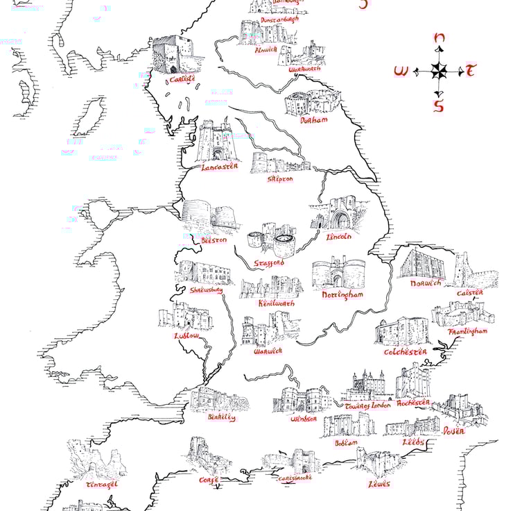 Tolkien style, hand drawn map of the Castles of England