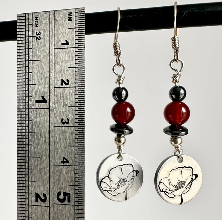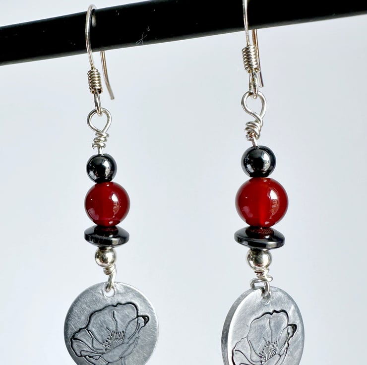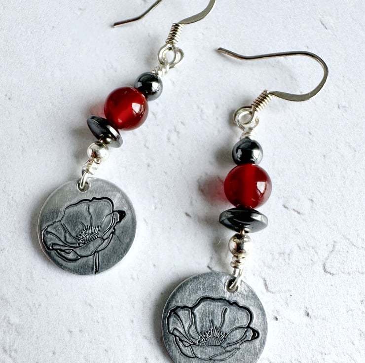 The perfect reminder of summer wild flowers. 1cm wide brushed Aluminium disks featuring hand-stamped poppy flowers. Silver-plated ear hooks (silicone stopper provided). The stones featured are 6mm red jade along with 4mm hematite.