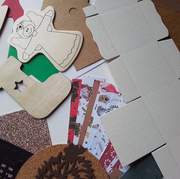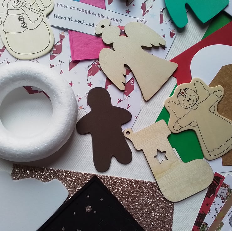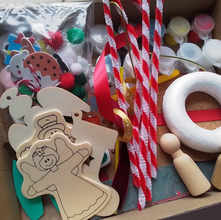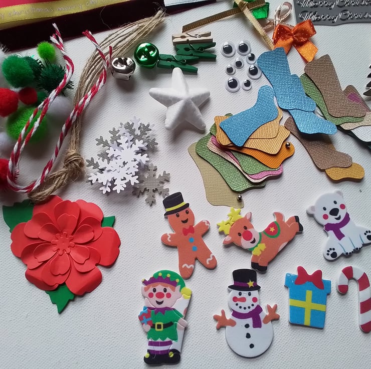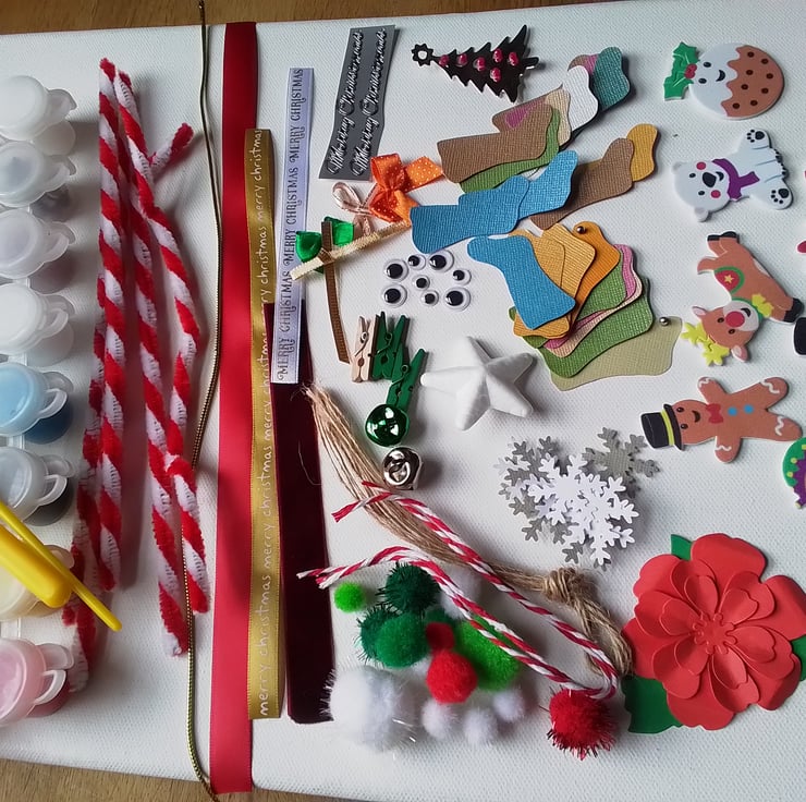 Included in the kit are paints, glue, glitter, sequins, glue stick and paint brush. Also pipe cleaners, pom poms, bells and googly eyes. Stockings, words, ribbon, flower, c9rd and bows.