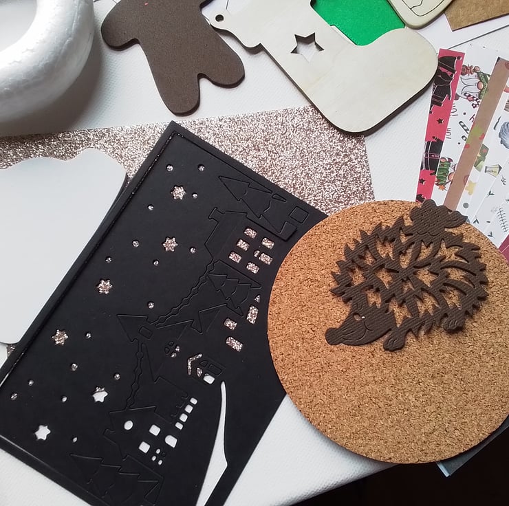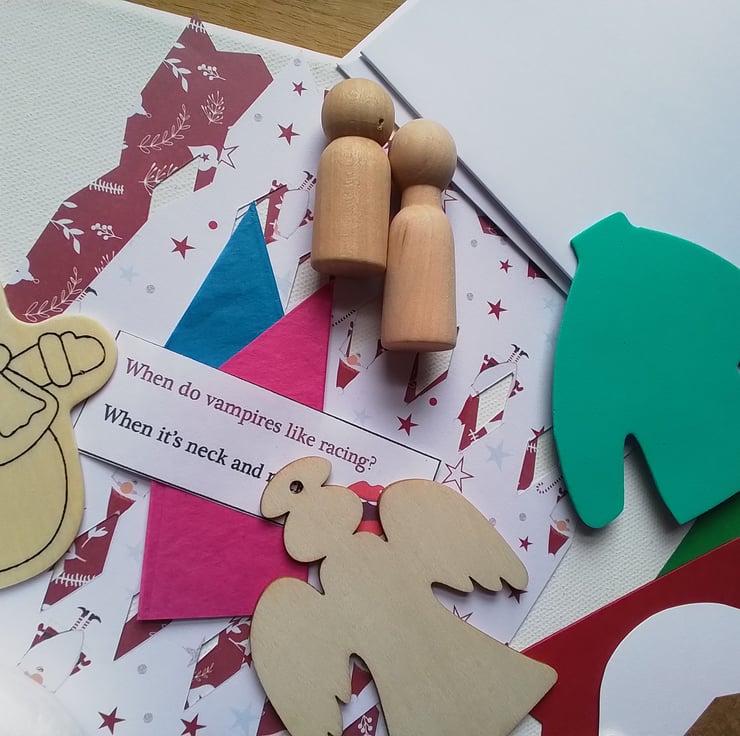 To make, there are Chrsitmas crackers with joke and hats, book marks, card and envelope, a wreath and star. Also gift tags, jumper, hat and gingerbread person, hegpdgehog, gift box, drink mat and nativity scene.