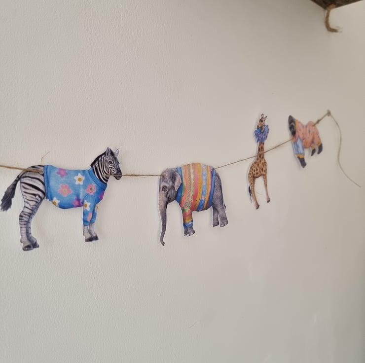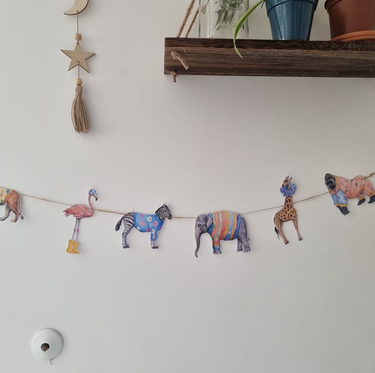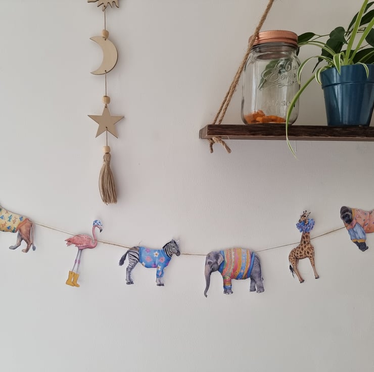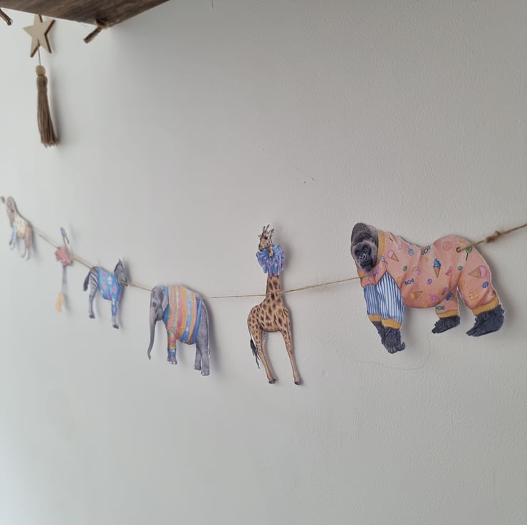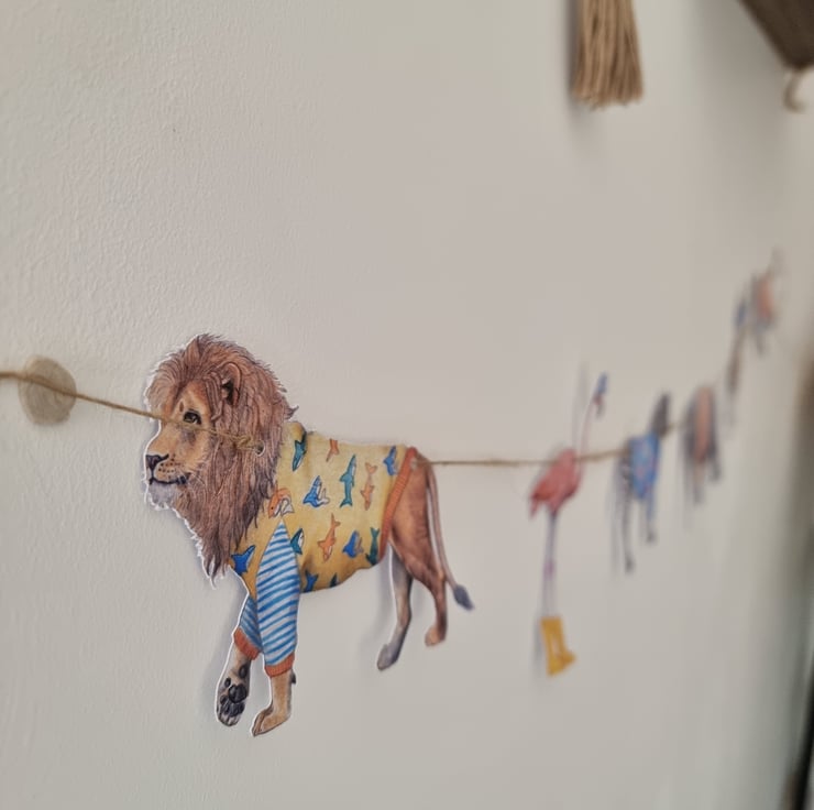 I love to draw the most unlikely animals wearing clothes. I then decided to make these delightful animals into bunting so children can have some cosy decor in their bedrooms.